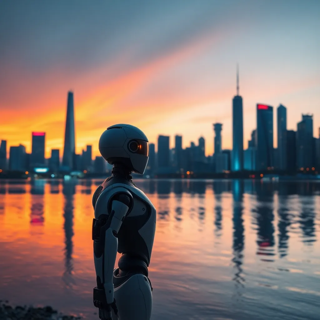 Create an image of a futuristic cityscape at sunset, with sleek skyscrapers and neon lights reflecting off a serene lake. In the foreground, a humanoid robot stands on the shore, gazing out at the city with a warm, golden light emanating from its eyes. Incorporate subtle, shimmering effects to give the image a sense of depth and dimensionality.
