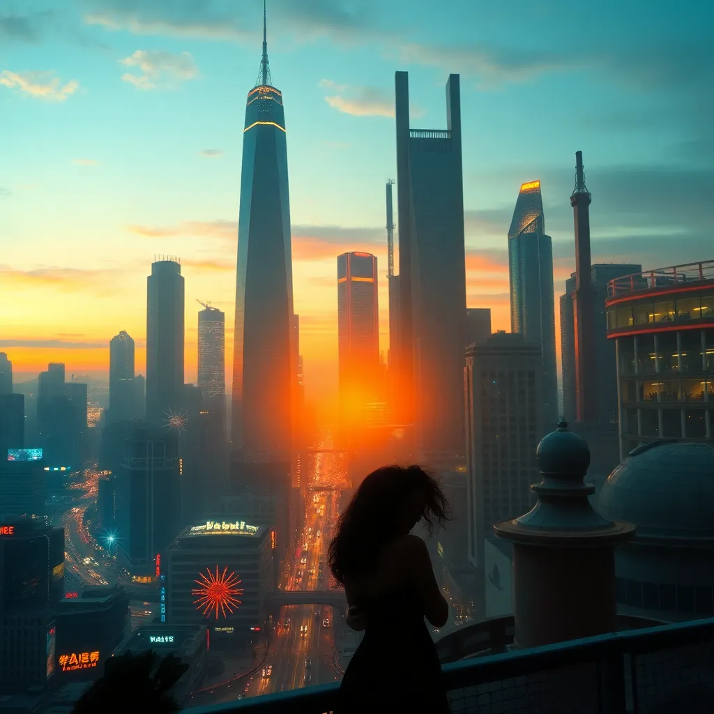 Create an image of a futuristic cityscape at sunset, with sleek skyscrapers and neon lights reflecting off the water. Incorporate a romantic element, such as a couple embracing on the rooftop or a lone figure gazing out at the city with a thoughtful expression. Incorporate pastel colors and subtle glow effects.