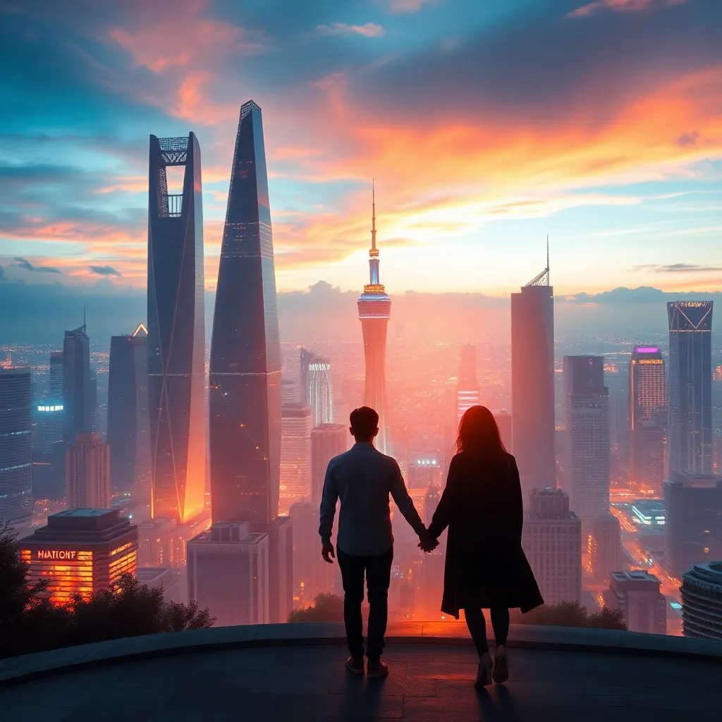 Create an image of a futuristic cityscape at sunset, with sleek skyscrapers and neon lights reflecting off the water. Incorporate a romantic couple, dressed in elegant attire, standing on the edge of the city, gazing out at the breathtaking view, with a subtle glow surrounding them, symbolizing their love and connection.