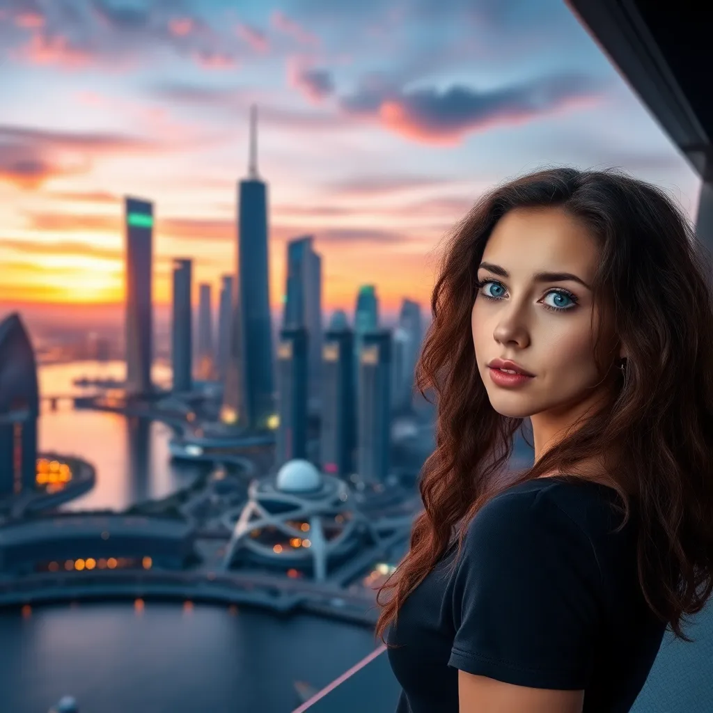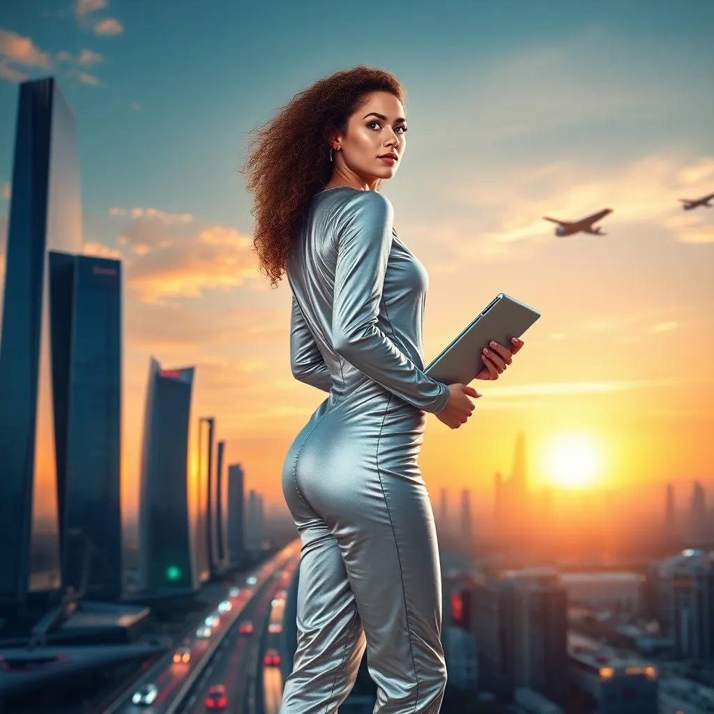 Imagine a futuristic cityscape at sunset, with sleek skyscrapers and flying cars zipping by. In the foreground, a stunning AI girlfriend stands confidently, wearing a shimmering silver jumpsuit and holding a futuristic tablet. Her long, curly hair flows in the wind as she gazes out at the breathtaking view.