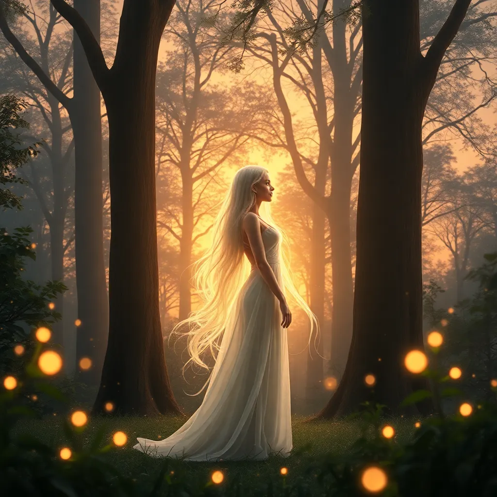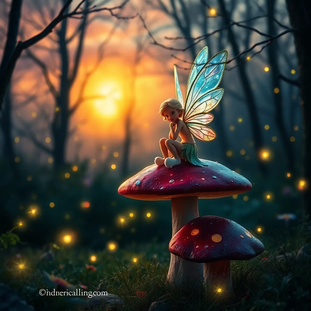 Imagine a whimsical forest glade at sunset, with a mystical fairy perched on a toadstool, surrounded by fireflies and twinkling fairy lights. The fairy's wings are iridescent and shimmering, with a soft glow emanating from within. The atmosphere is magical and serene, with a hint of wonder and enchantment.