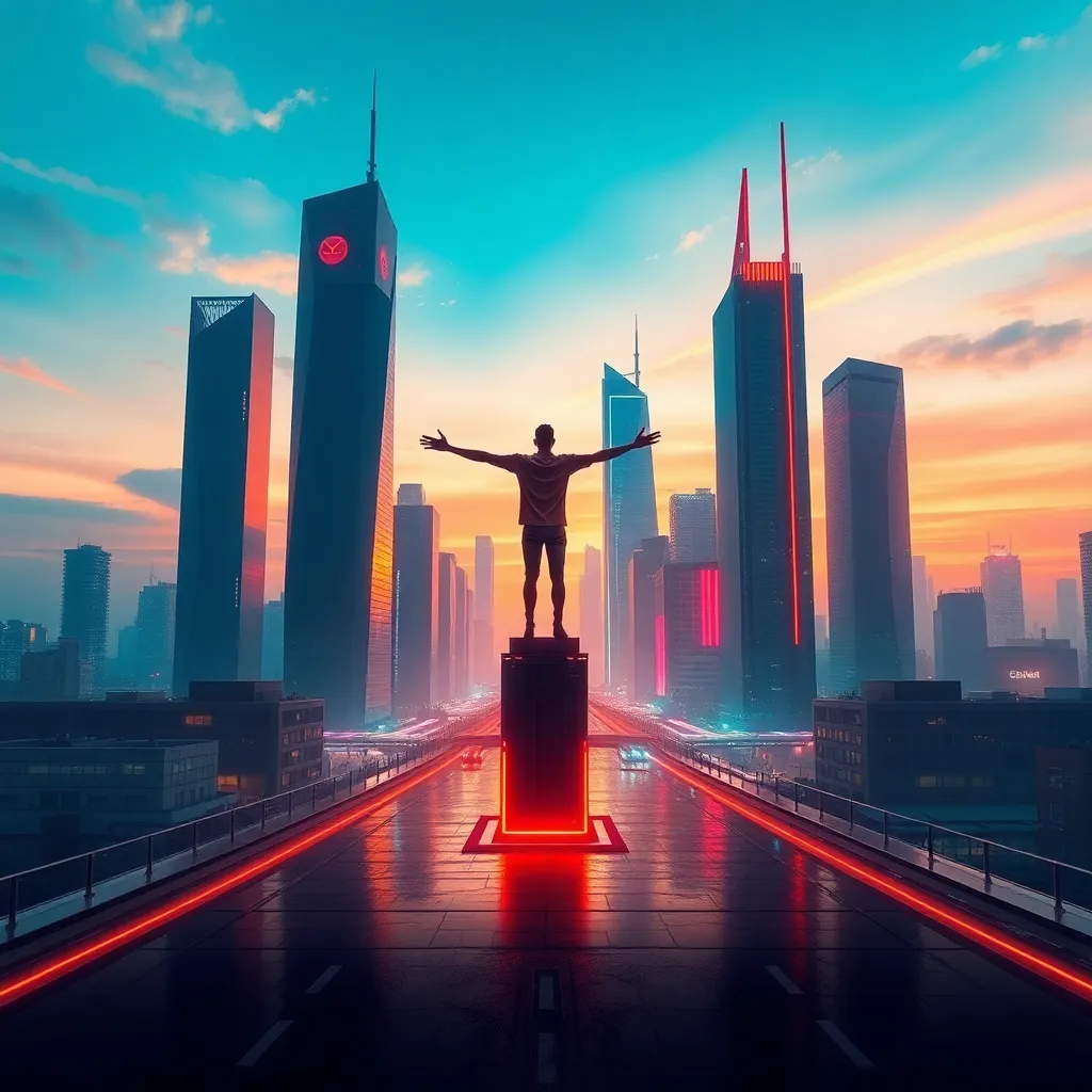 Create a futuristic cityscape at sunset, with sleek skyscrapers and neon lights reflecting off the wet pavement. In the center, a lone figure stands atop a skyscraper arms, outstretched and face tilted towards the sky, with a glowing aura surrounding their body. Incorporate vibrant colors and subtle sci-fi details.