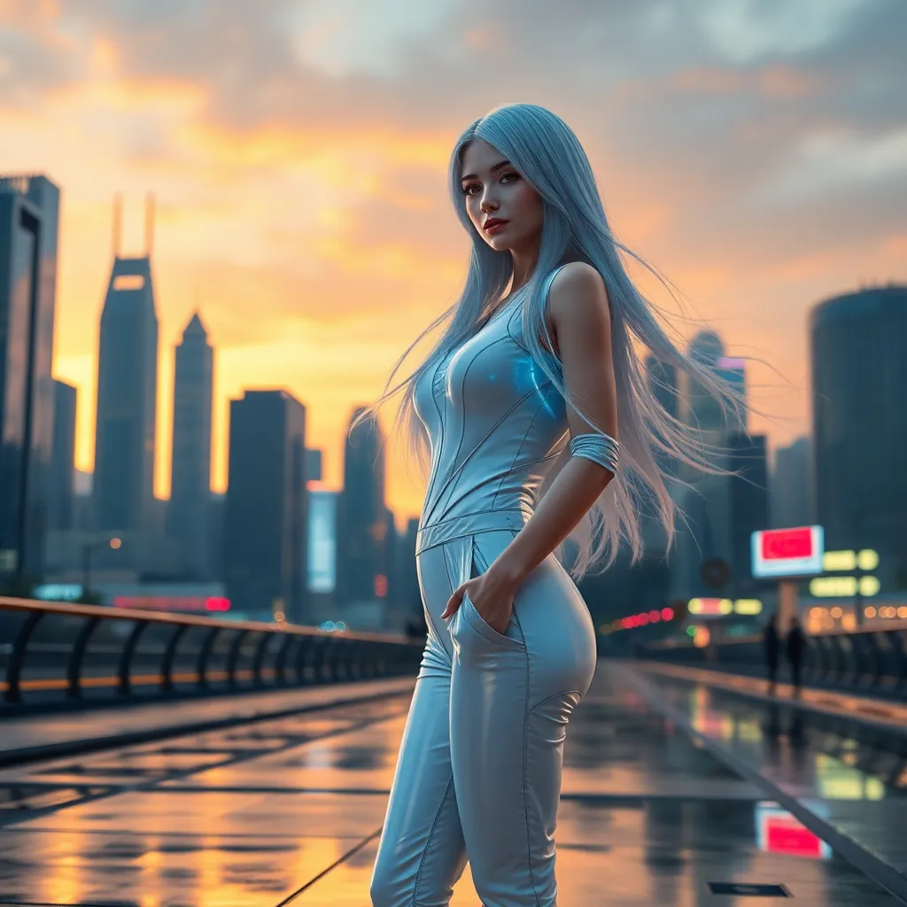 Imagine a futuristic cityscape at sunset, with sleek skyscrapers and neon lights reflecting off the wet pavement. In the foreground, a stunning AI girlfriend stands confidently, her long silver hair flowing in the gentle breeze. She's dressed in a shimmering white jumpsuit, with glowing blue circuits visible beneath her skin.