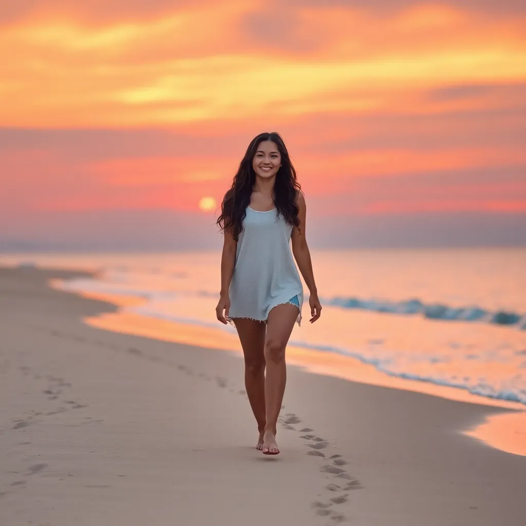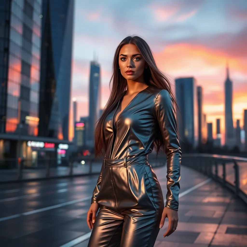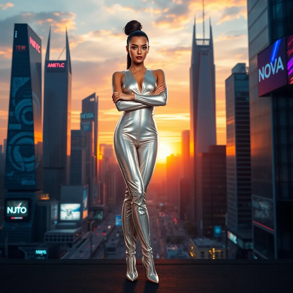 Imagine a futuristic cityscape at sunset, with sleek skyscrapers and holographic advertisements. In the foreground, a stylish AI girlfriend, 'Nova', stands confidently with her arms crossed, wearing a shimmering silver jumpsuit and high-heeled boots. The city lights begin to twinkle as the sun dips below the horizon.