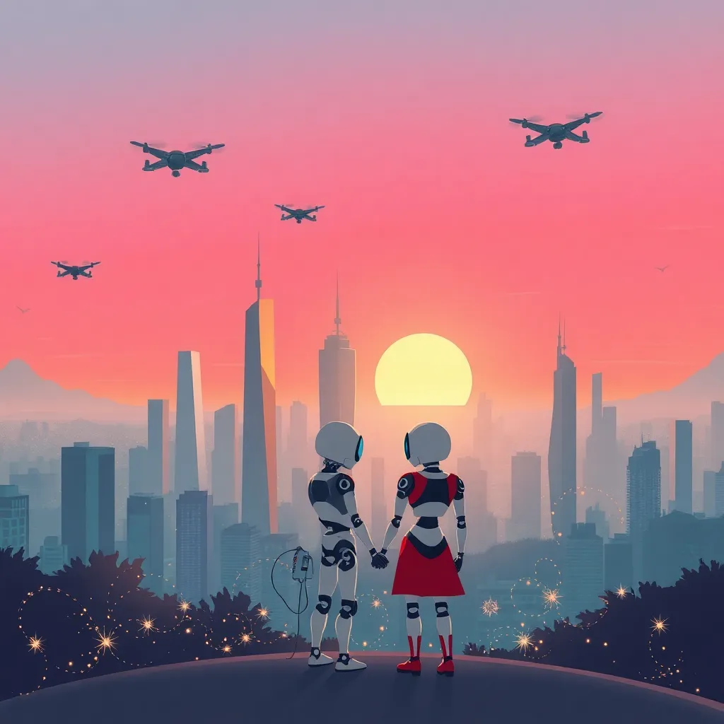 Create a whimsical illustration of a futuristic cityscape at sunset, with towering skyscrapers and holographic advertisements glowing against a vibrant orange and pink sky. Incorporate a couple walking hand-in-hand in the foreground, surrounded by floating robots and levitating vehicles, with a subtle hint of steampunk-inspired details.