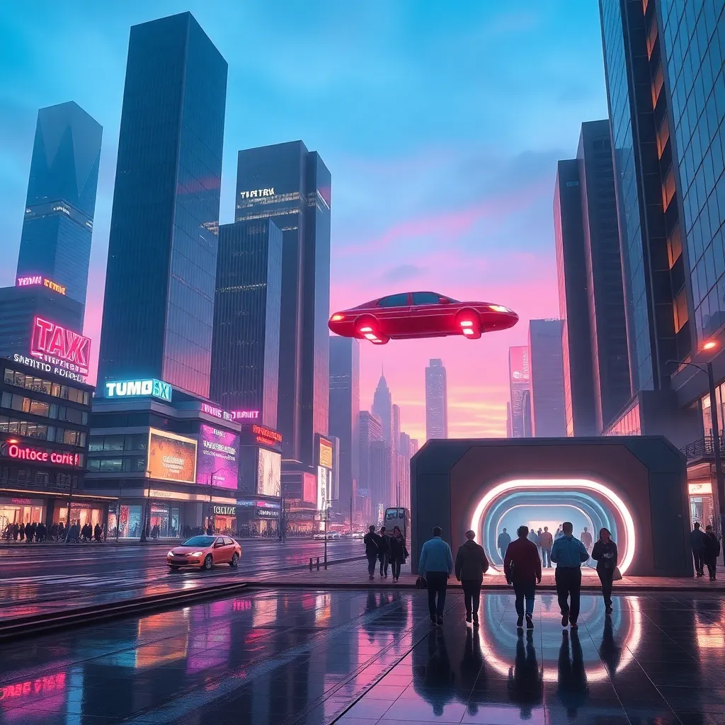Create a futuristic cityscape at dusk, with sleek skyscrapers and neon lights reflecting off the wet pavement. Incorporate a flying taxi hovering above the streets, and a group of people walking towards a glowing metro entrance. The atmosphere should be vibrant and energetic, with a sense of excitement and possibility.