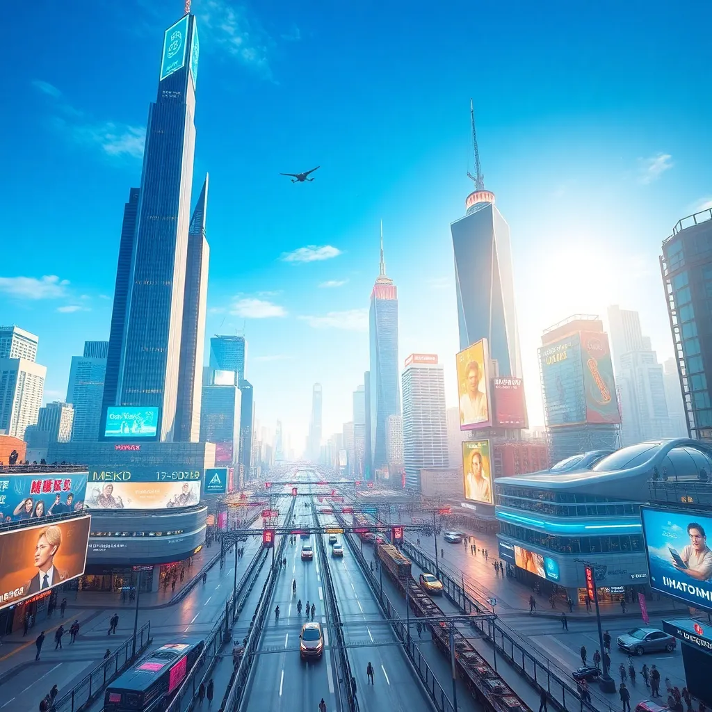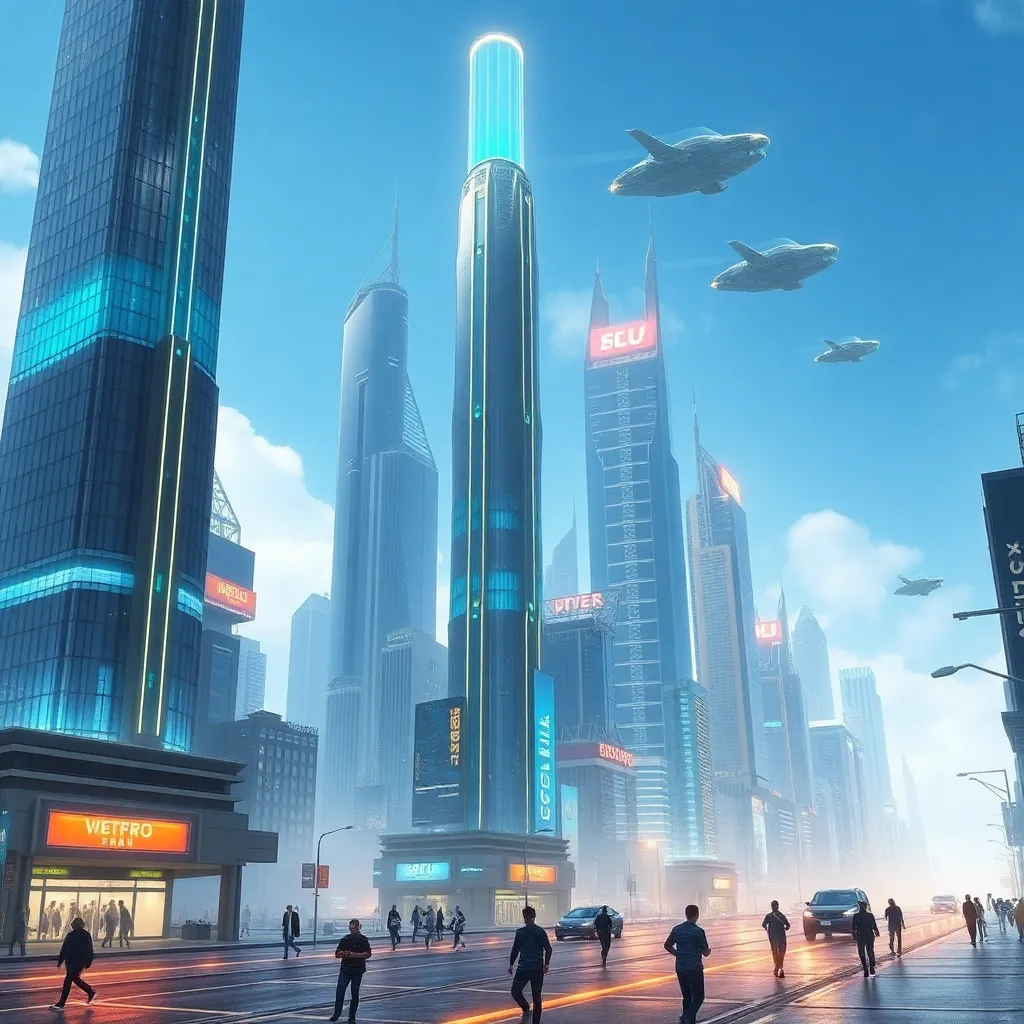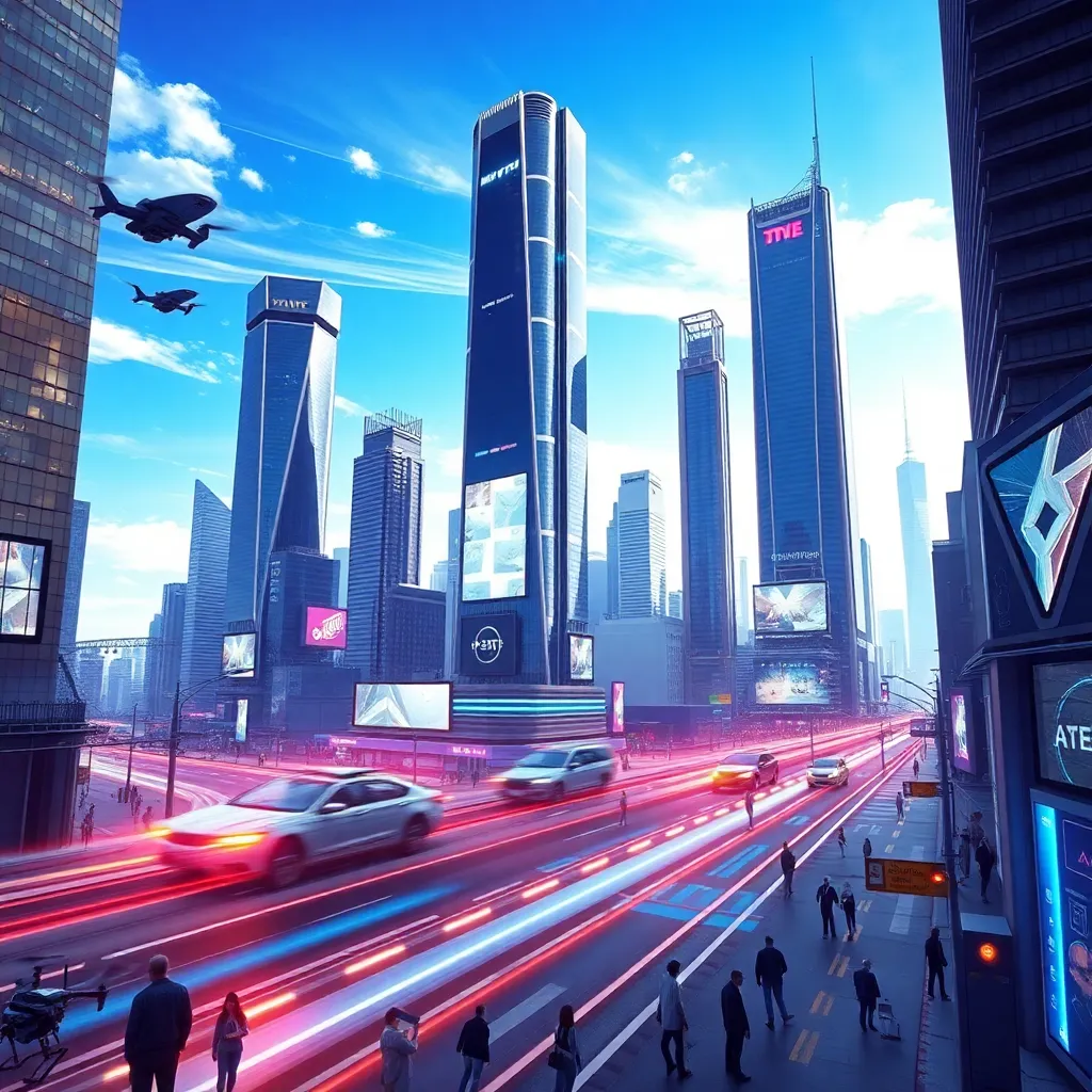 Generate a futuristic cityscape with sleek skyscrapers, flying cars zipping by, and a bright blue sky with a few wispy clouds. Incorporate neon lights and holographic advertisements to create a vibrant atmosphere. The city should be bustling with people, robots, and drones going about their daily lives.