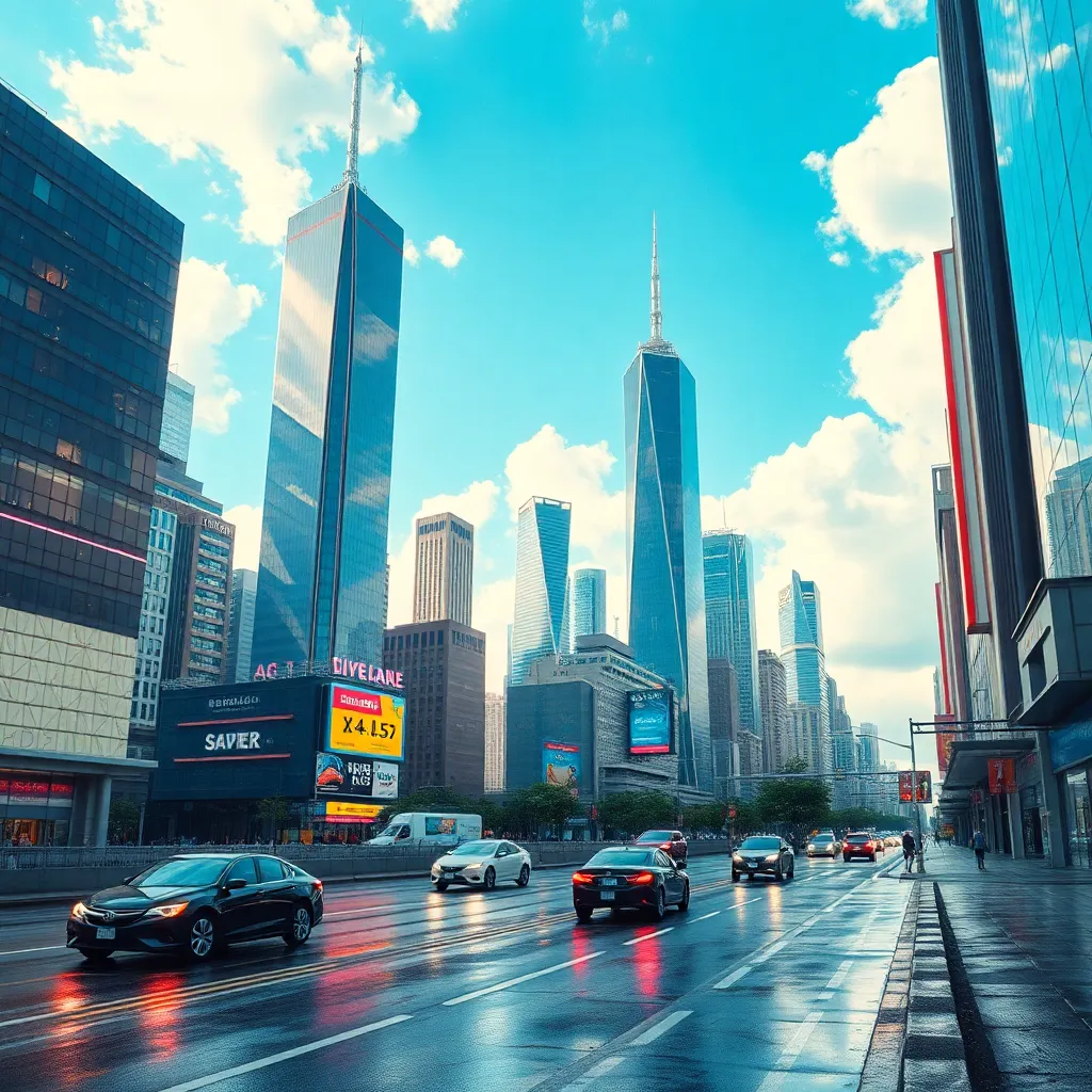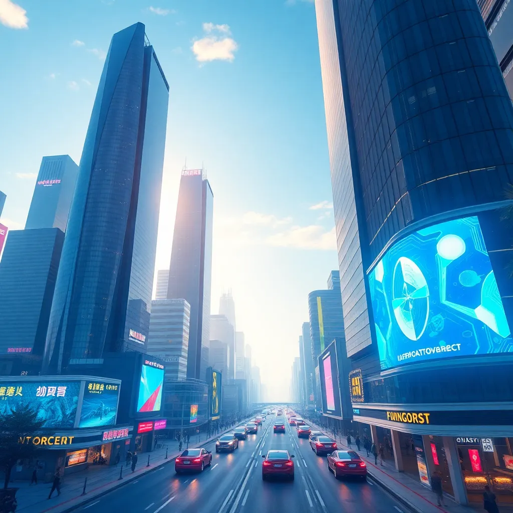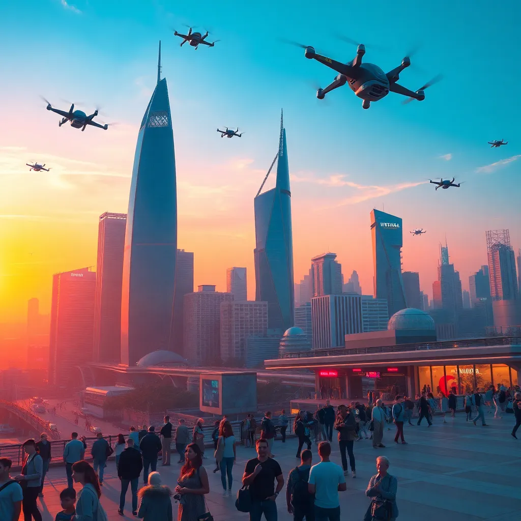 Generate a futuristic cityscape with sleek skyscrapers, flying cars zipping by, and a bright blue sky with a few wispy clouds. Incorporate neon lights and holographic advertisements to create a vibrant atmosphere. The city should be bustling with people, robots, and drones going about their daily lives.