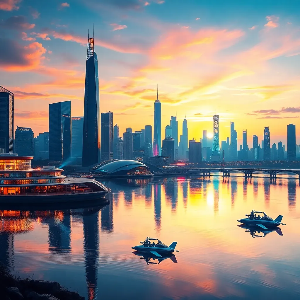 Imagine a futuristic cityscape at sunset, with sleek skyscrapers, flying cars, and humans in futuristic attire. The city is surrounded by a serene lake, with a vibrant city skyline reflected in the water. Generate an AI image that captures this futuristic yet peaceful atmosphere, with a blend of neon lights and natural hues.