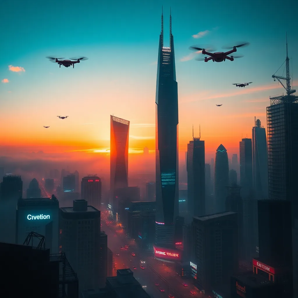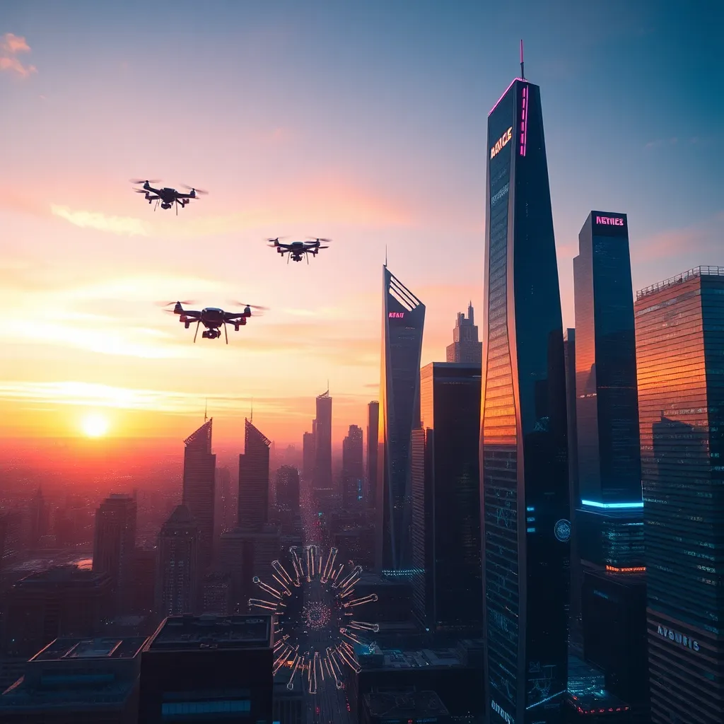 Create a futuristic cityscape at sunset, with towering skyscrapers and a vibrant city life. Incorporate neon lights, flying drones, and a sense of movement. The city should be surrounded by a misty atmosphere, with a hint of industrial and technological elements. The image should be vibrant and full of energy.