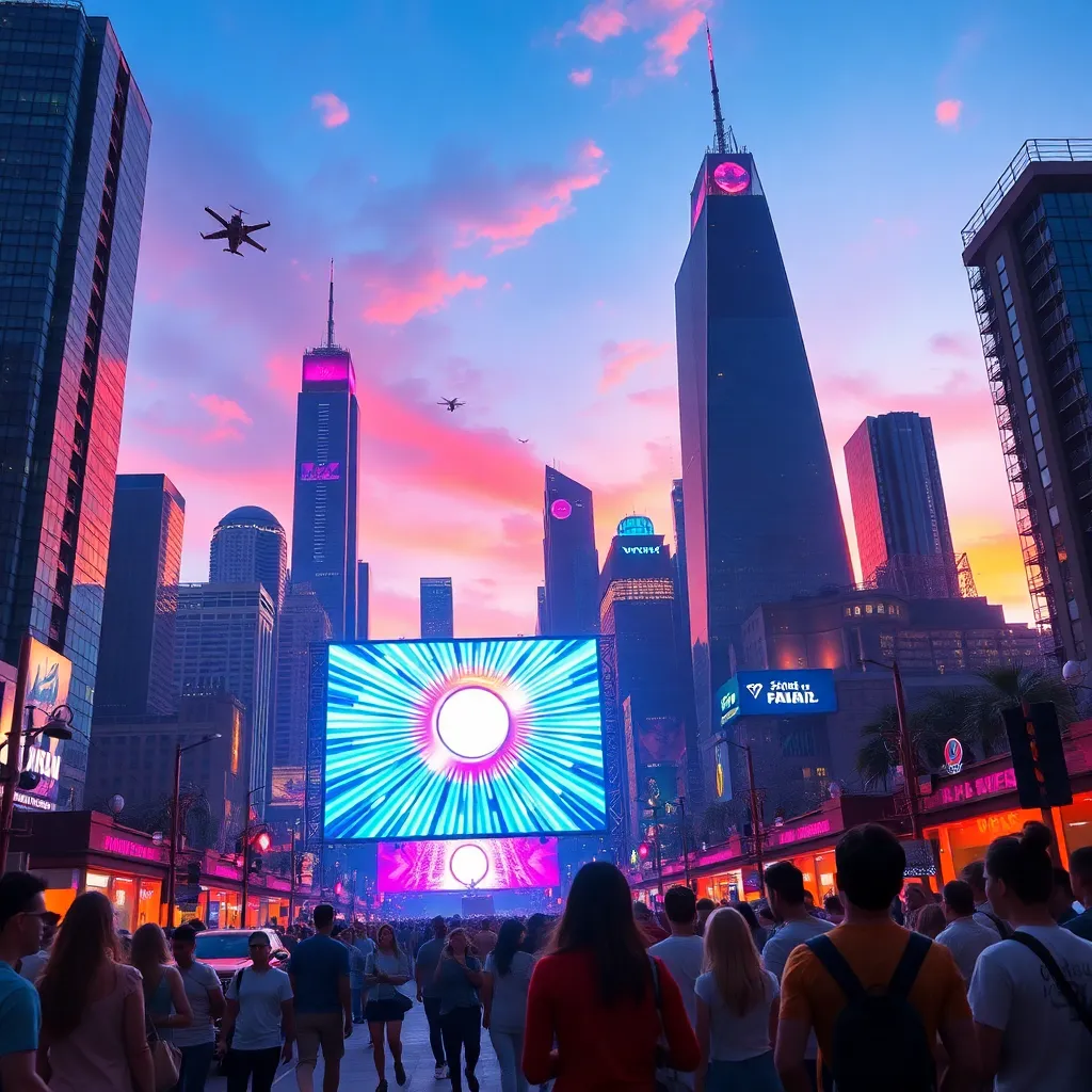 Create a futuristic cityscape at sunset with towering skyscrapers, flying cars, and neon lights. Incorporate a group of people from diverse backgrounds enjoying a street festival, with a giant screen displaying a mesmerizing light show. The atmosphere should be vibrant, energetic, and full of wonder.