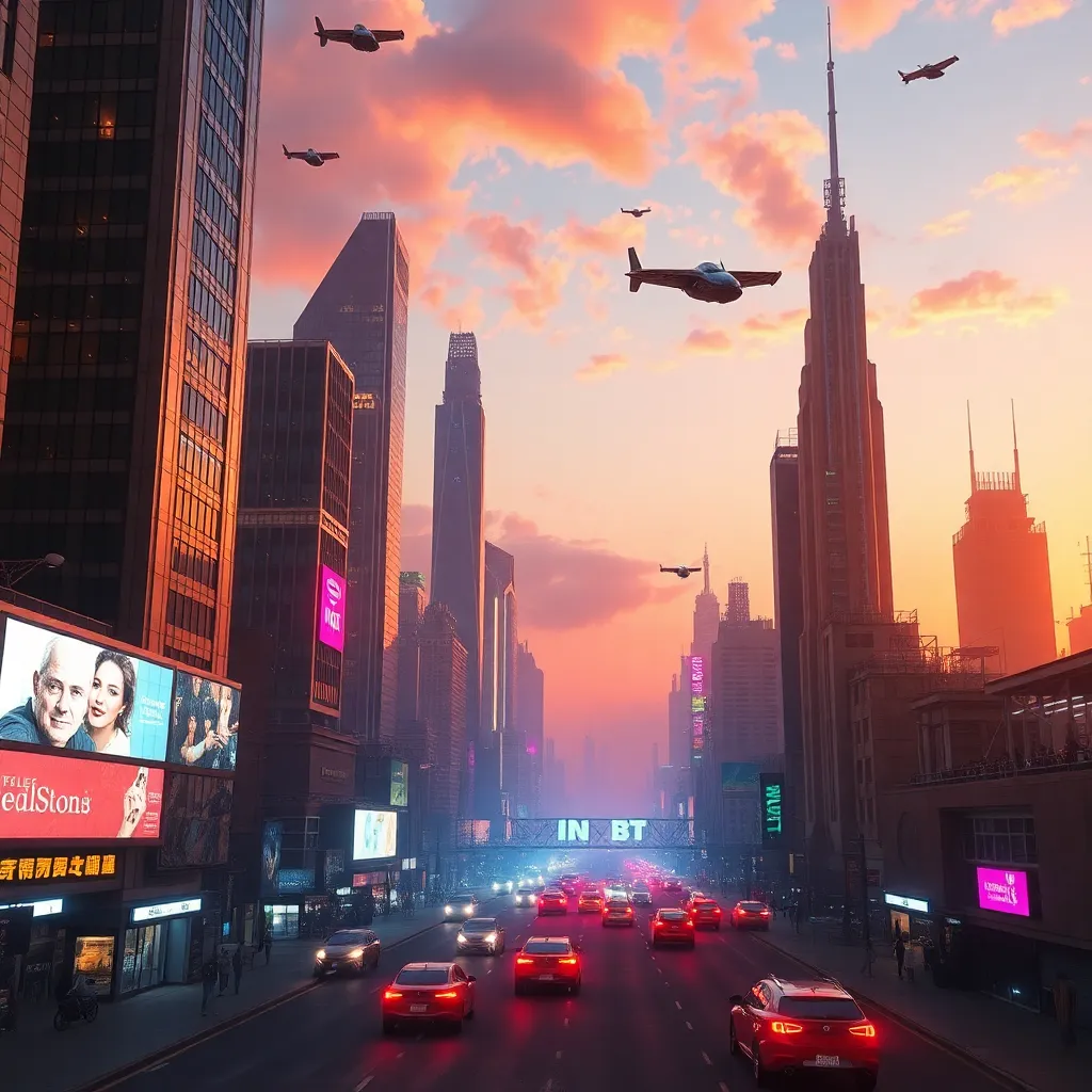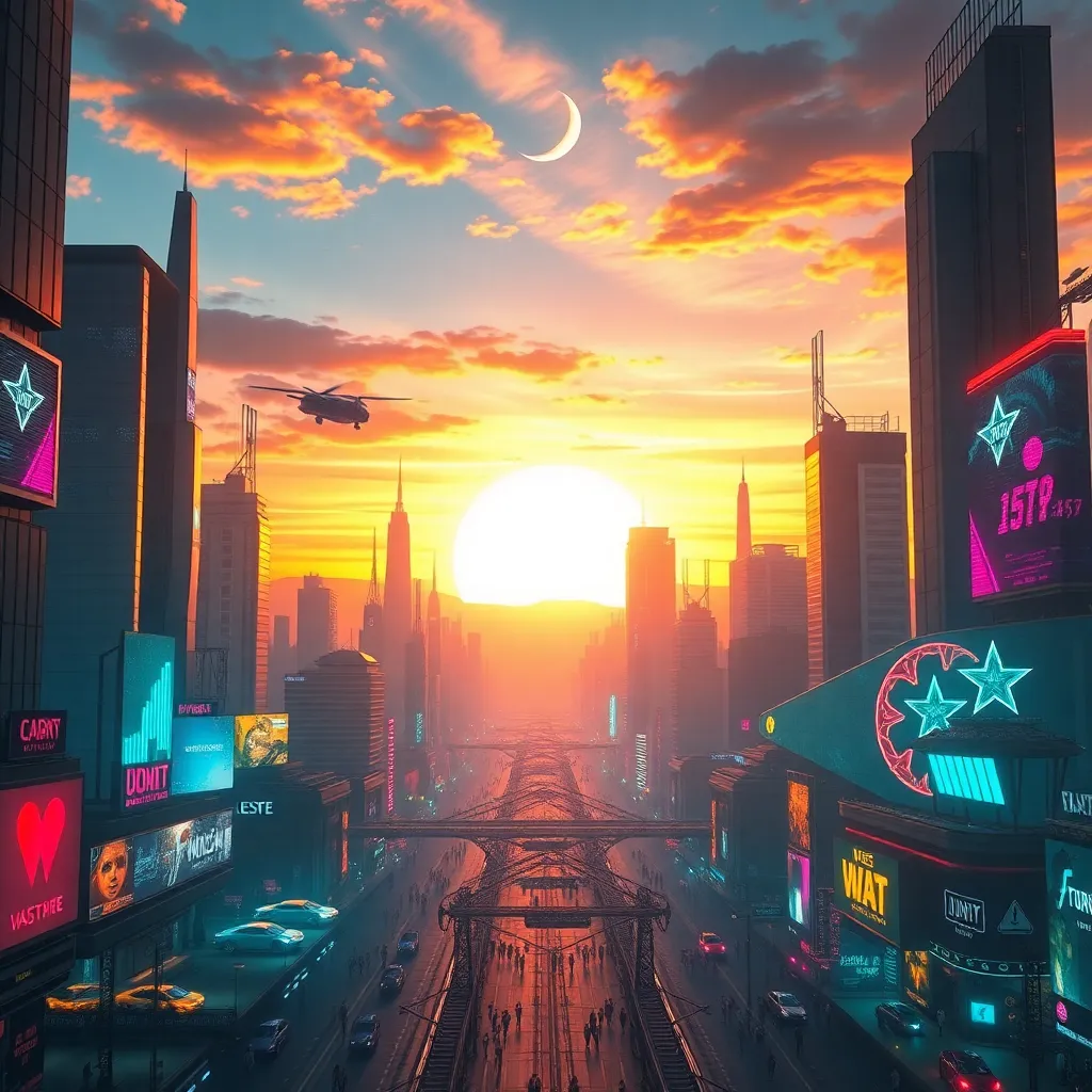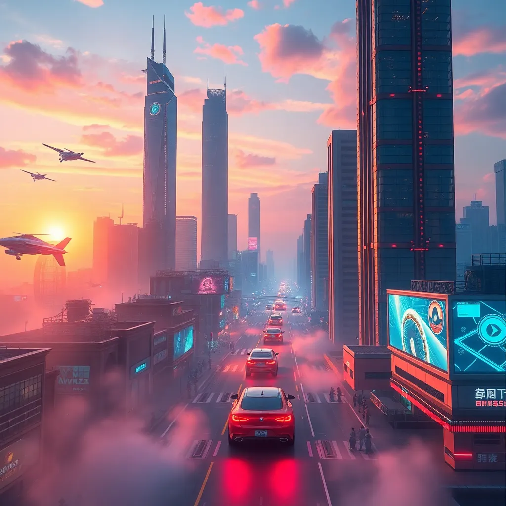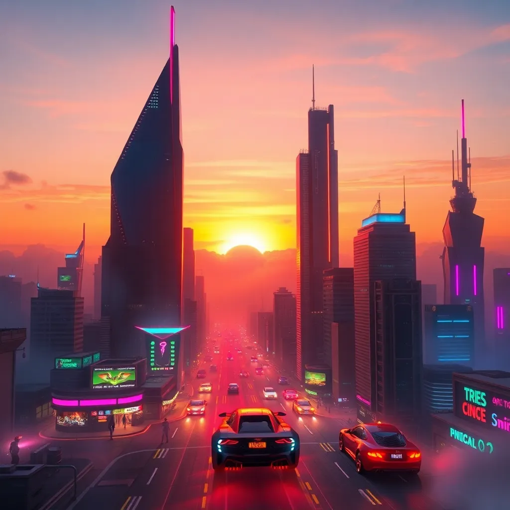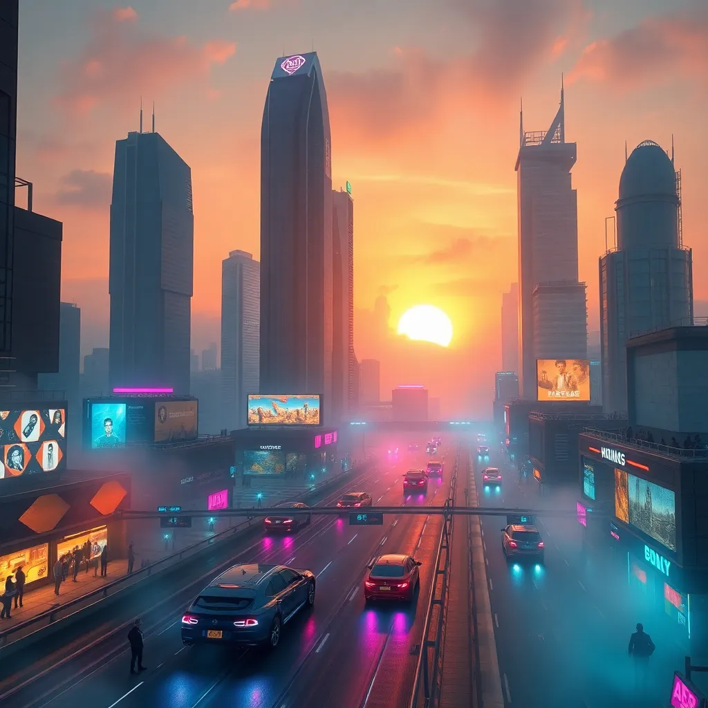 Create an AI-generated image of a futuristic cityscape at sunset, with sleek skyscrapers, flying cars, and a vibrant atmosphere. Incorporate neon lights, holographic advertisements, and a bustling street scene. The image should evoke a sense of innovation and progress, with a warm and inviting color palette.