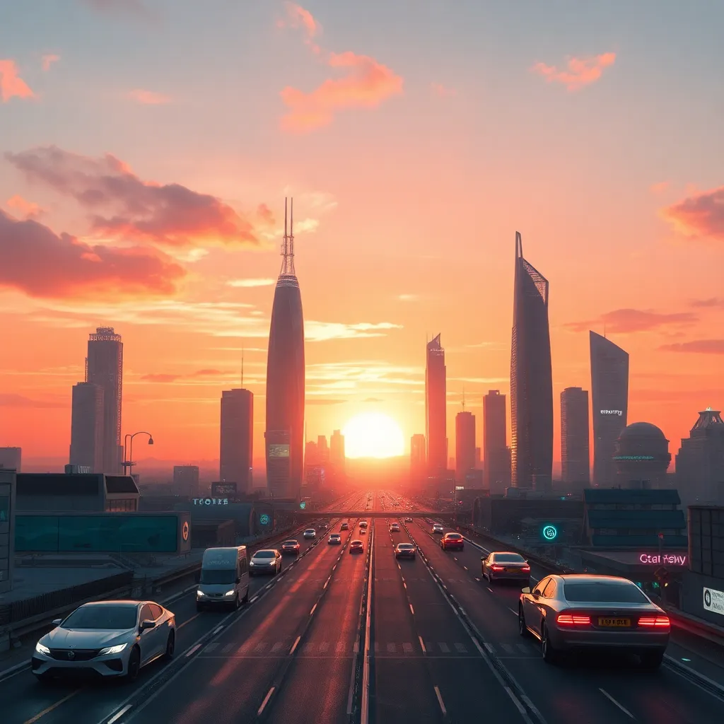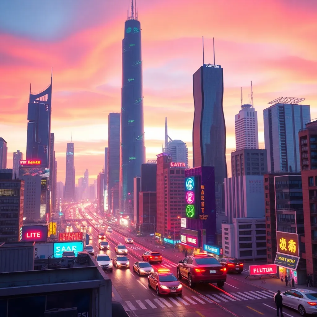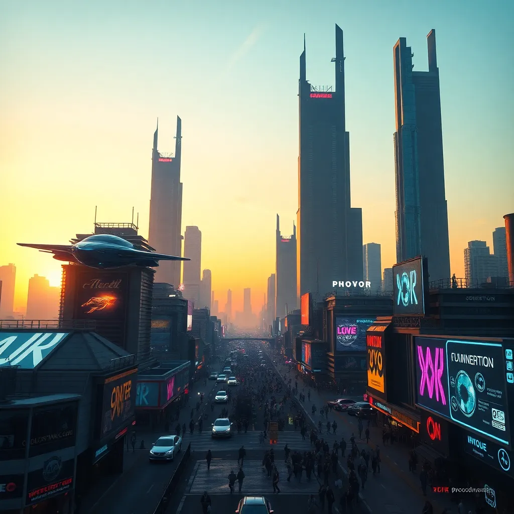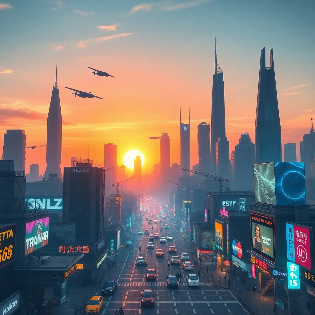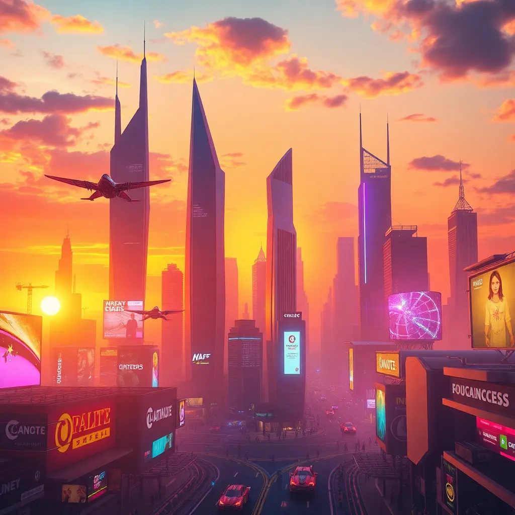 Create an AI-generated image of a futuristic cityscape at sunset, with sleek skyscrapers, flying cars, and a vibrant atmosphere. Incorporate neon lights, holographic advertisements, and a bustling street scene. The image should evoke a sense of innovation and progress, with a warm and inviting color palette.