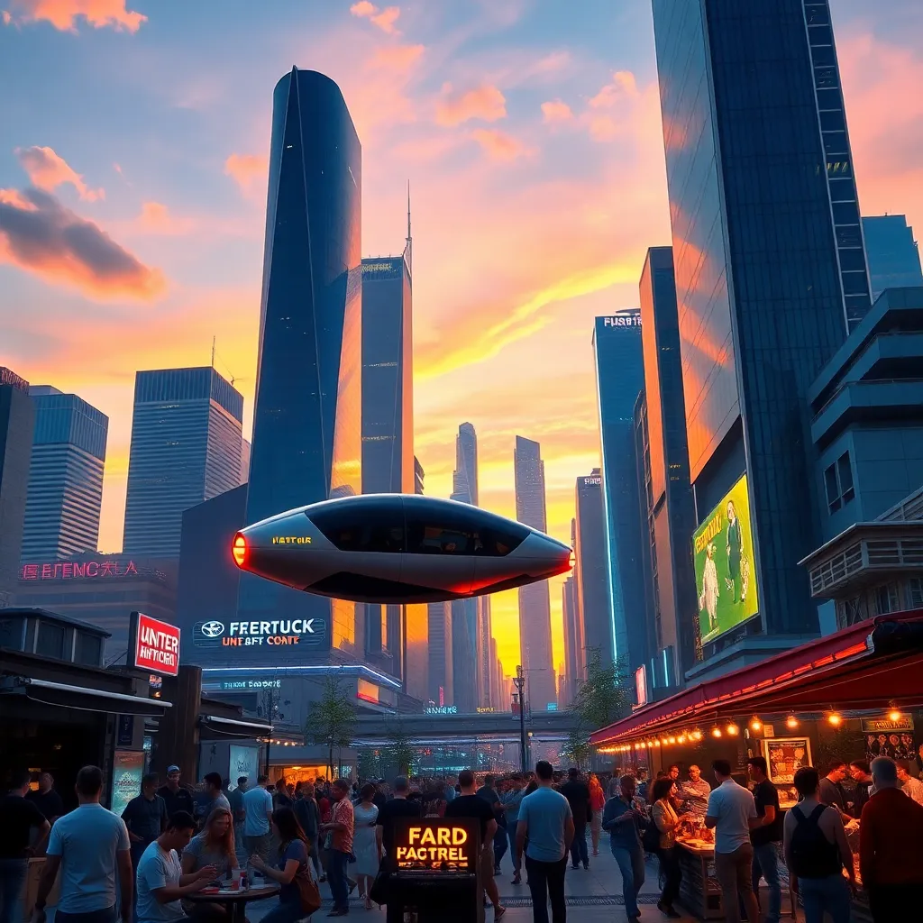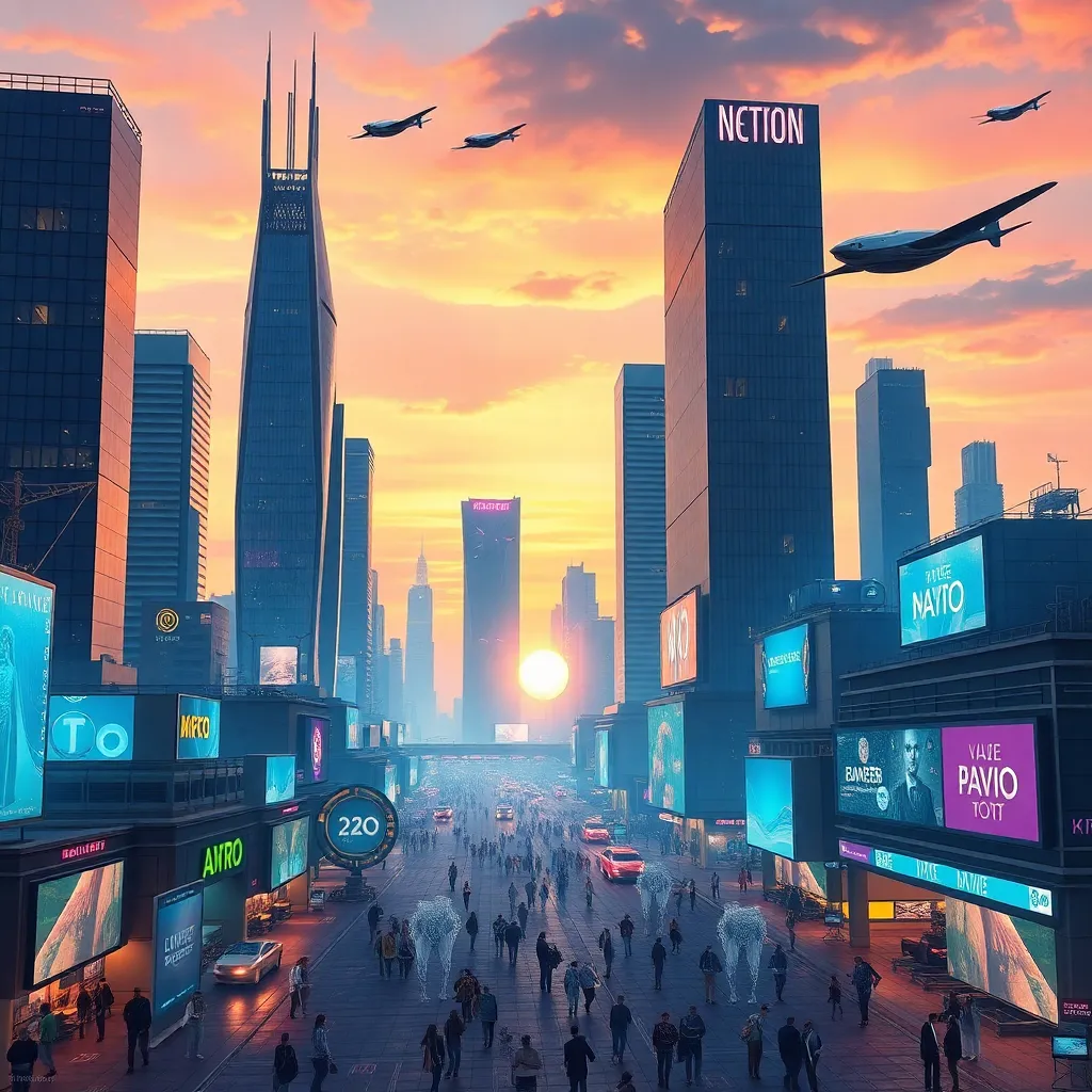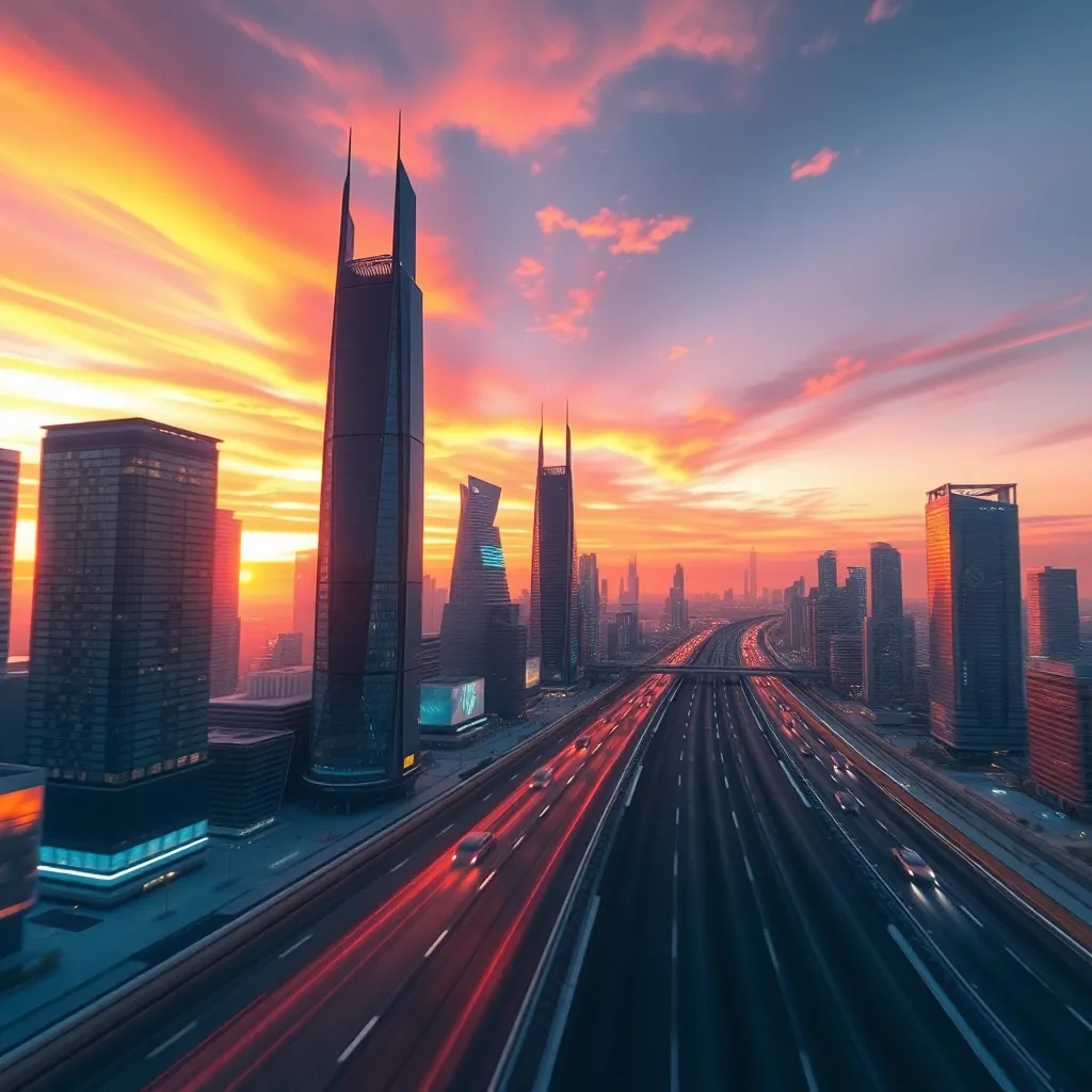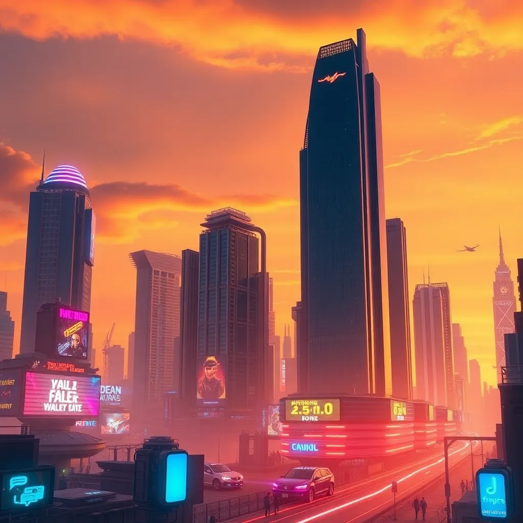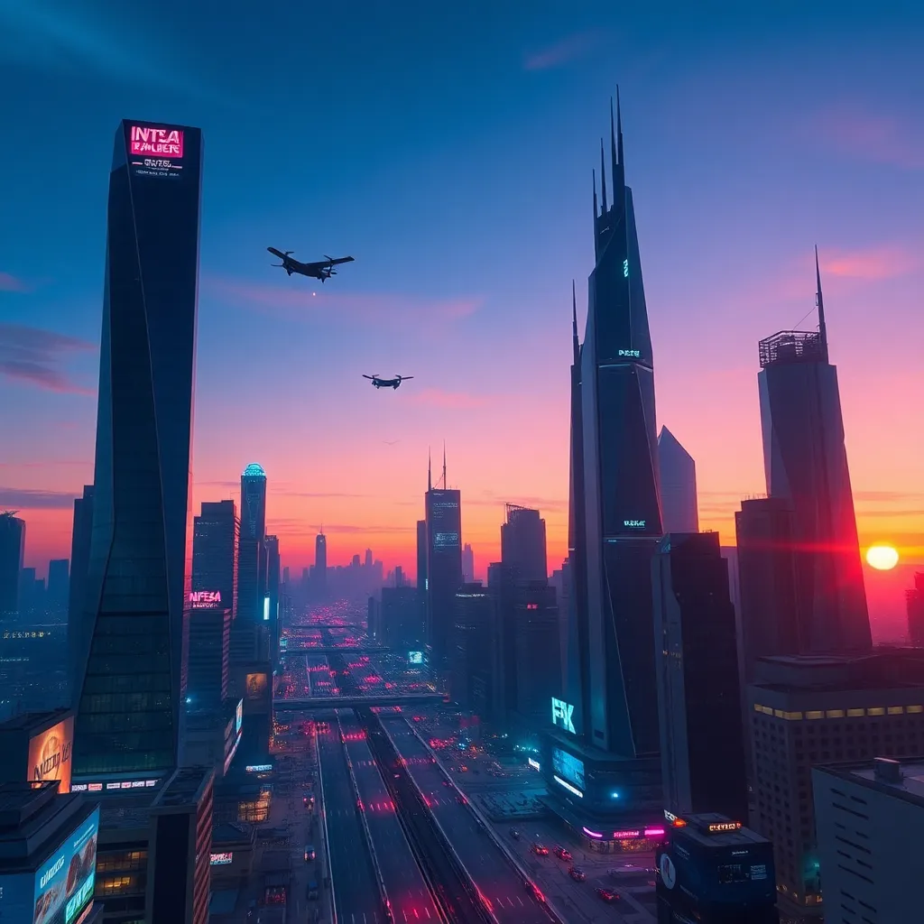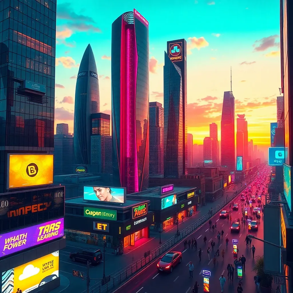Create an AI-generated image of a futuristic cityscape at sunset, with sleek skyscrapers, flying cars, and a vibrant atmosphere. Incorporate neon lights, holographic advertisements, and a bustling street scene. The image should evoke a sense of innovation and progress, with a warm and inviting color palette.