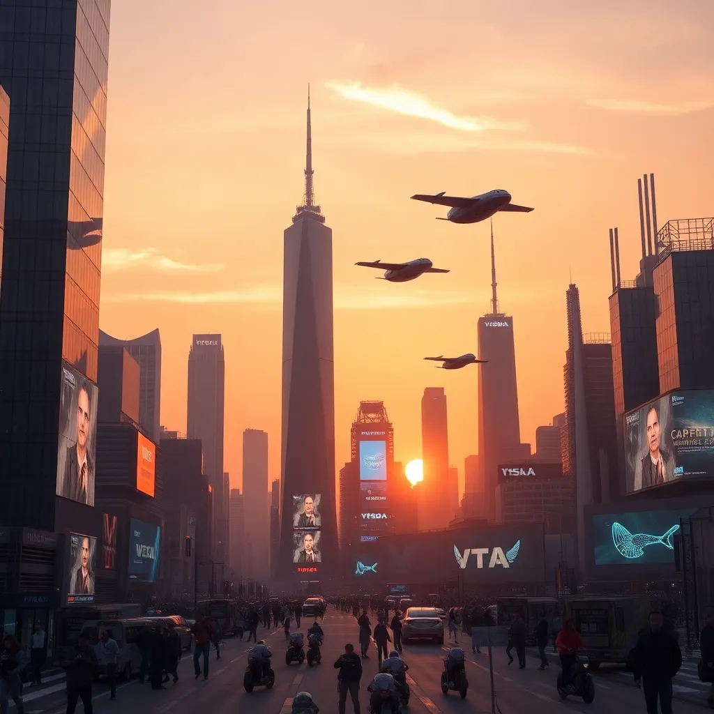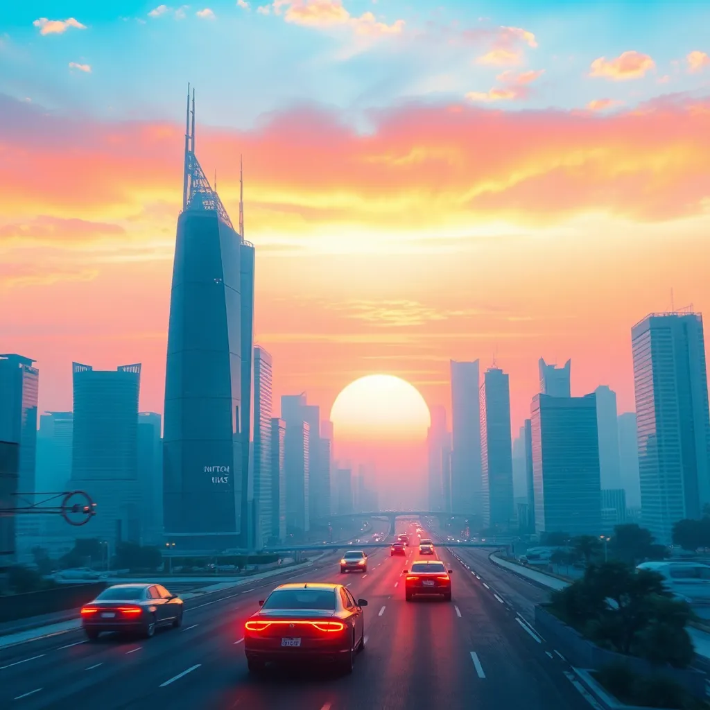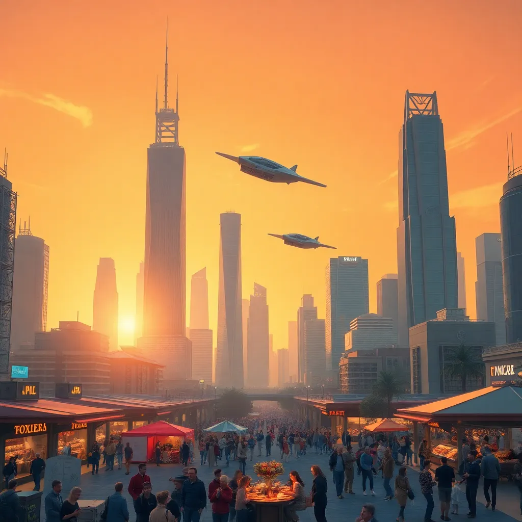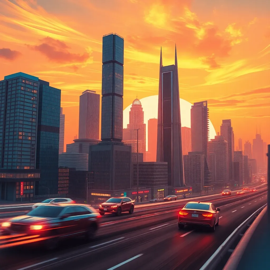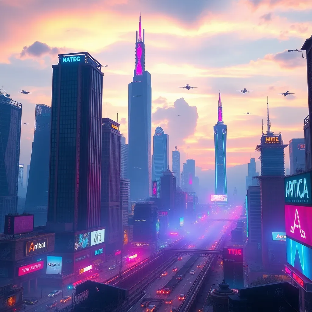 Create an AI-generated image of a futuristic cityscape at sunset, with sleek skyscrapers, flying cars, and a vibrant atmosphere. Incorporate neon lights, holographic advertisements, and a bustling street scene. The image should evoke a sense of innovation and progress, with a warm and inviting color palette.