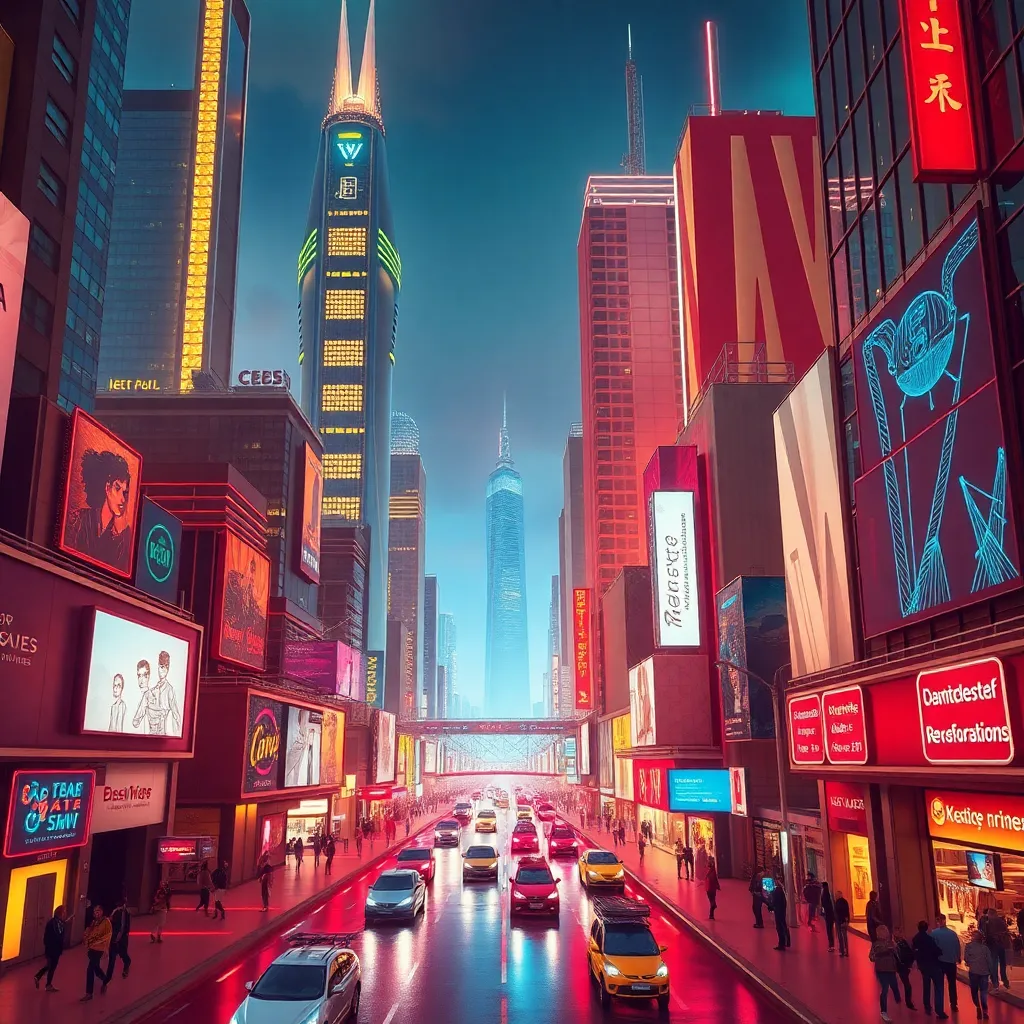 Create a futuristic cityscape with sleek skyscrapers, neon lights, and a bustling street scene. Incorporate flying cars, robots, and holographic advertisements. The atmosphere should be vibrant and energetic, with a sense of innovation and progress. Use a mix of warm and cool colors to create a dynamic visual effect.
