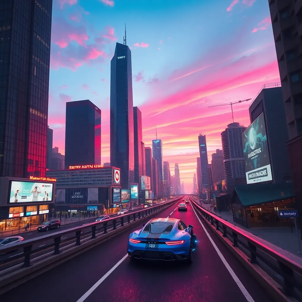 Create a futuristic cityscape at dusk, with towering skyscrapers, neon lights, and a bustling street scene. Incorporate a sleek, electric blue sports car driving down the highway, surrounded by holographic advertisements and a vibrant, purple-pink sunset sky. The city should exude a sense of innovation and progress.