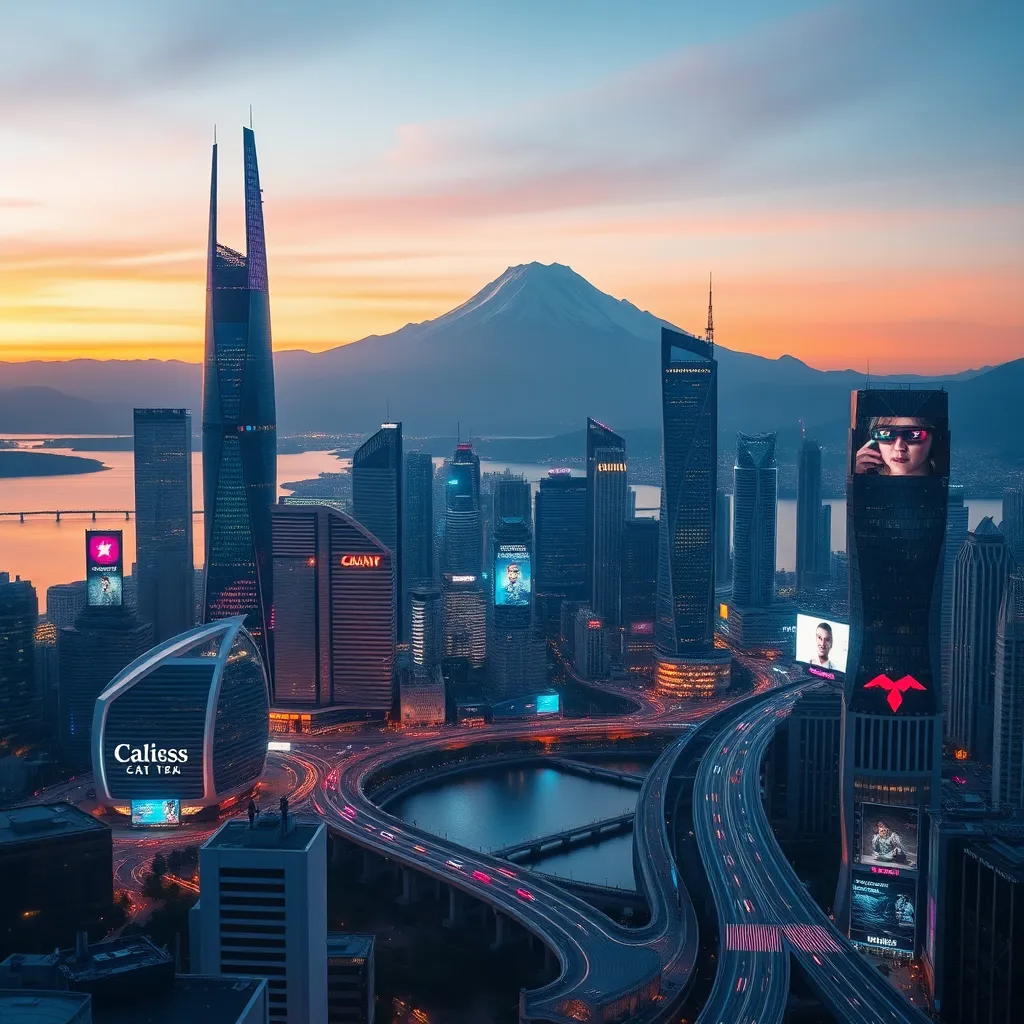 Create a futuristic cityscape at sunset, with sleek skyscrapers, flying cars, and humans in augmented reality contact lenses. Incorporate neon lights, holographic advertisements, and a sense of bustling energy. The city should be surrounded by a serene lake with a majestic mountain range in the background.