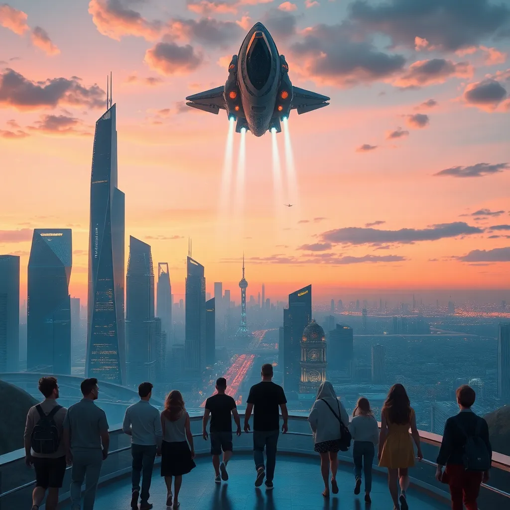 Create a futuristic cityscape at sunset, with sleek skyscrapers, neon lights, and a sprawling metropolis in the background. Incorporate a group of people from diverse backgrounds walking together, looking up at the sky in awe, as a massive spaceship descends from the clouds, casting a warm glow over the scene.