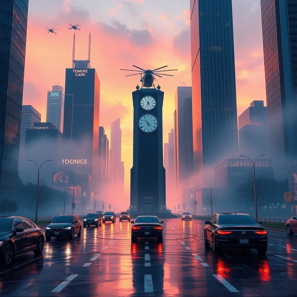 Create a futuristic cityscape at sunset, with sleek skyscrapers, flying cars, and humans in augmented reality contact lenses. The city should be surrounded by a misty atmosphere with neon lights reflecting off the wet pavement. Incorporate a prominent clock tower in the center, with a futuristic helicopter landing on the rooftop.