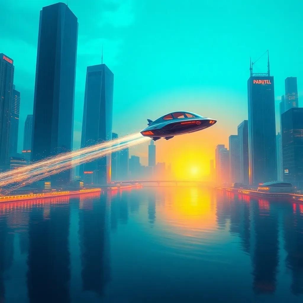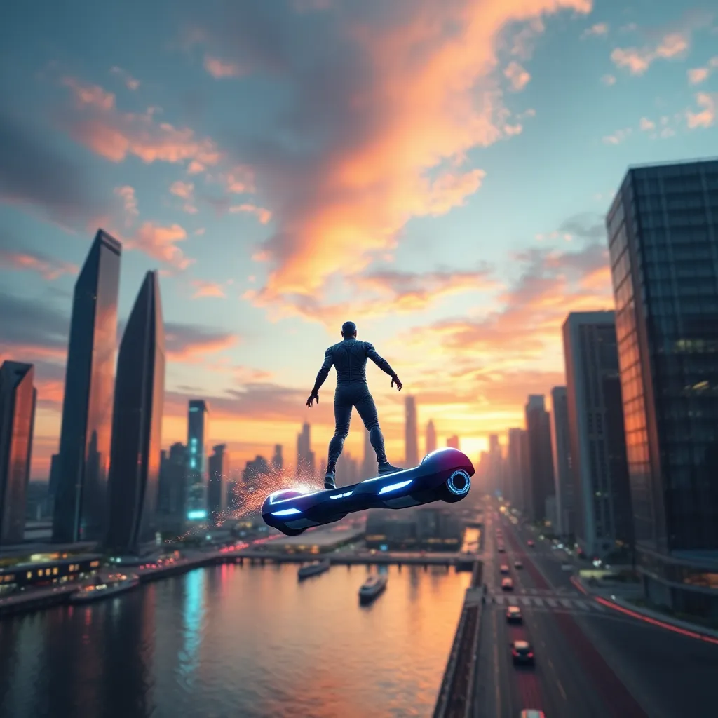 Imagine a futuristic cityscape at sunset, with sleek skyscrapers and neon lights reflecting off the water. A hoverboard is hovering above the city streets, with a figure in a sleek jumpsuit riding it, leaving a trail of sparks behind. The sky is ablaze with vibrant colors, a fusion of technology and nature.