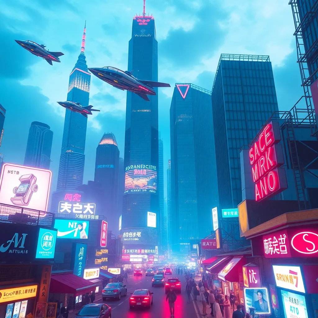 Create an AI-generated image of a futuristic cityscape with towering skyscrapers, flying cars, and a vibrant night market. Incorporate neon lights, holographic advertisements, and a sense of bustling energy. The image should evoke a sense of excitement and innovation, with a blend of futuristic and retro elements.