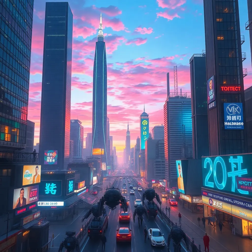 Create a futuristic cityscape at dusk, with towering skyscrapers, flying cars, and holographic advertisements. Incorporate a sense of neon-lit humidity and a vibrant, electric blue sky. The city should be bustling with activity, with people and robots moving in harmony. Generate an image that captures the essence of a metropolis in the year 2050.