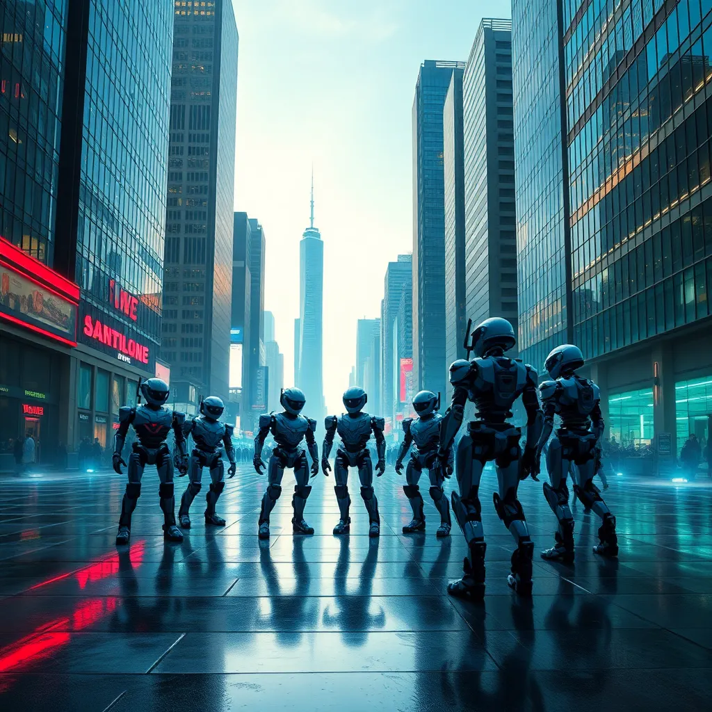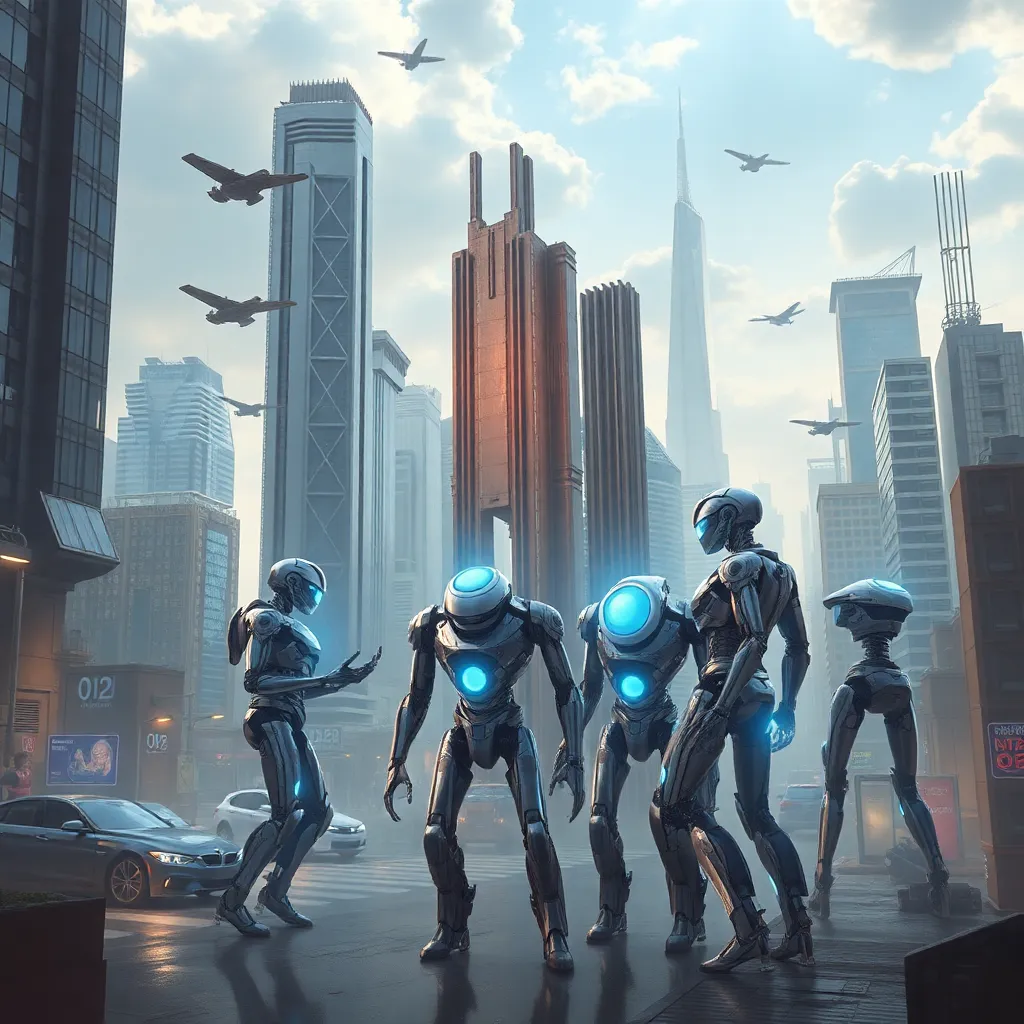 Imagine a futuristic cityscape at dusk, with sleek skyscrapers and neon lights reflecting off the wet pavement. A group of robots, each with its own unique design, are gathered at the city square, preparing for a grand celebration. The robots are surrounded by a halo of light, with a bright blue sky in the background.