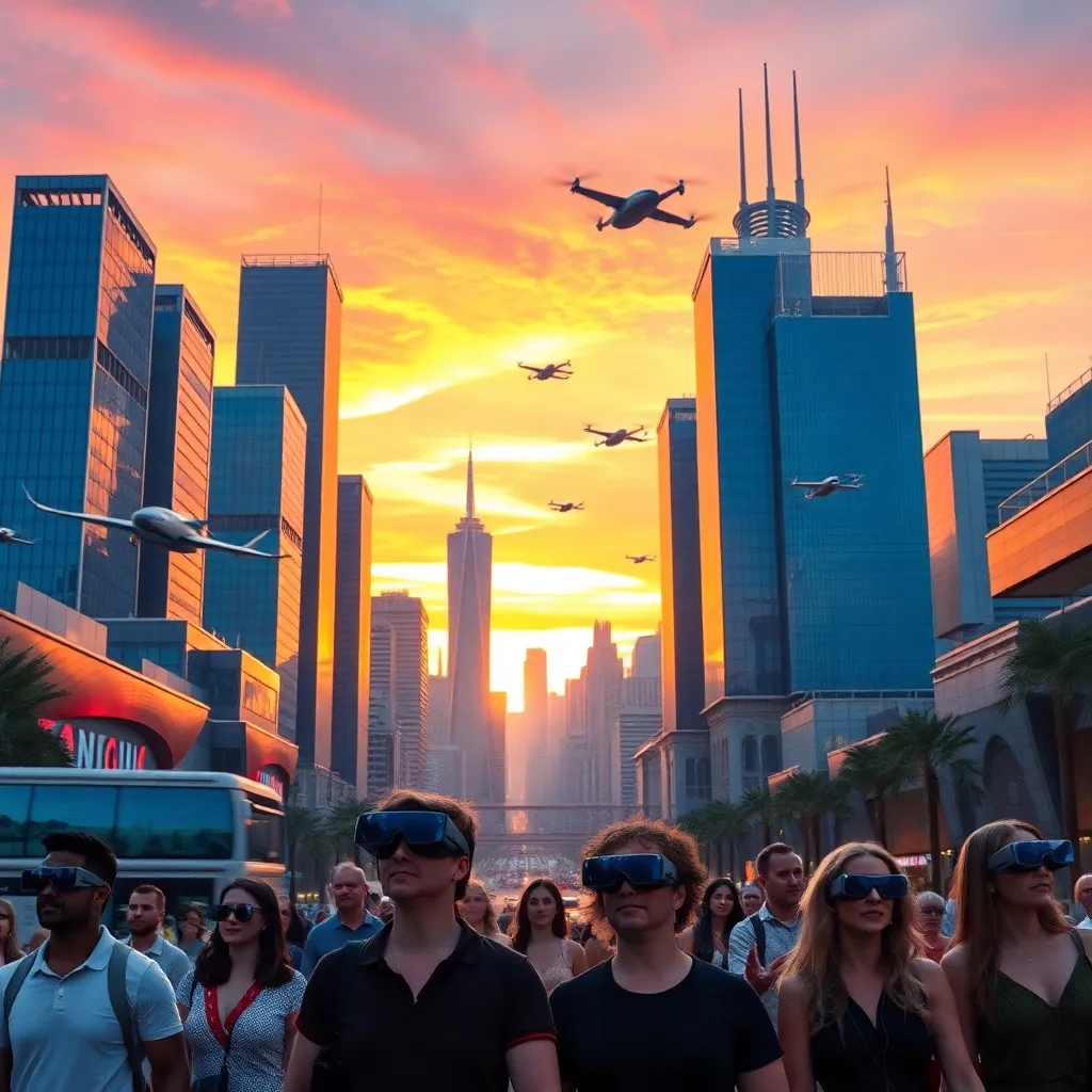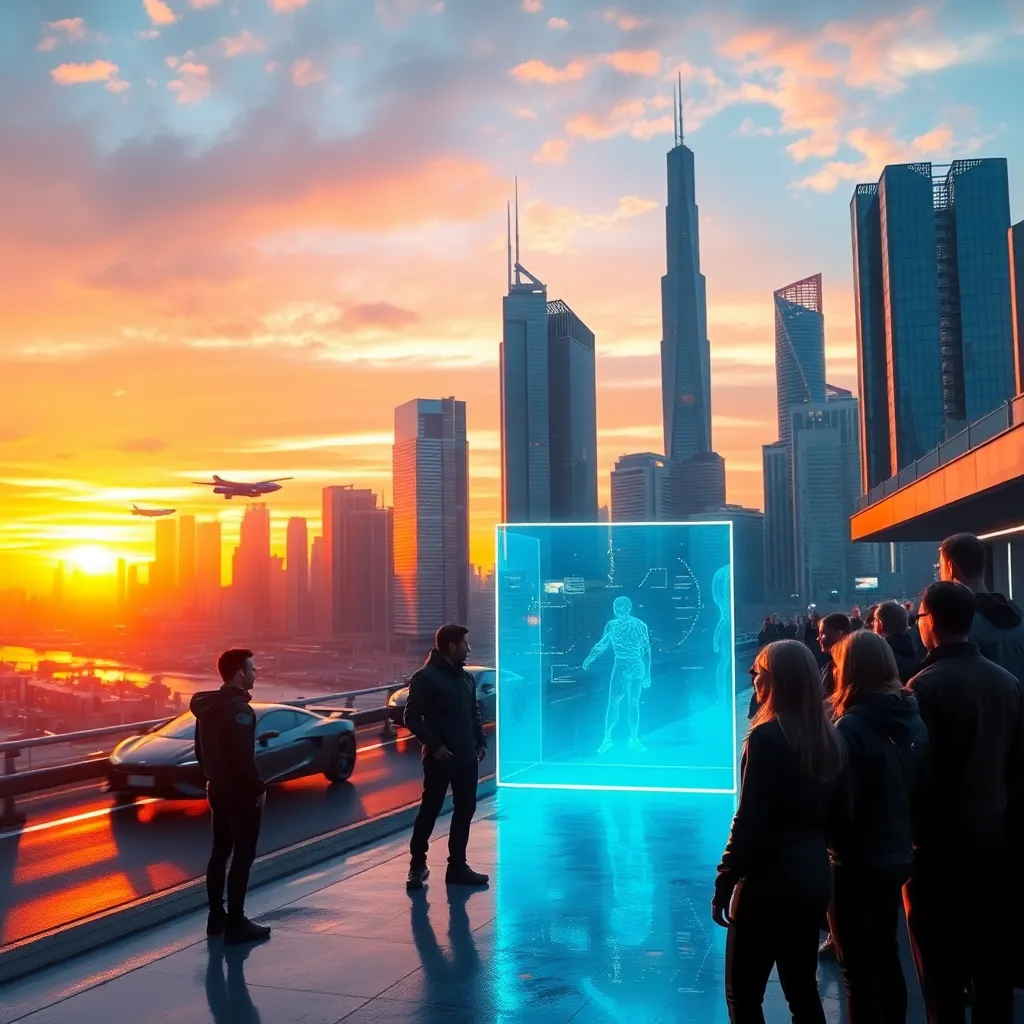 Imagine a futuristic cityscape at sunset, with sleek skyscrapers and flying cars zipping by. The city is surrounded by a glowing aura, with neon lights reflecting off the wet pavement. In the foreground, a group of people in futuristic attire are gathered around a holographic display, marveling at its beauty.