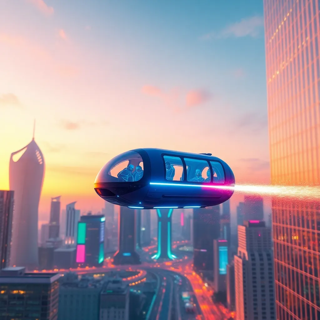 Imagine a futuristic cityscape at dusk, with sleek skyscrapers and neon lights illuminating the sky. A levitating transportation pod glides smoothly through the air, leaving a trail of sparks behind it. Generate an AI image that captures this mesmerizing scene, with vibrant colors and intricate details.