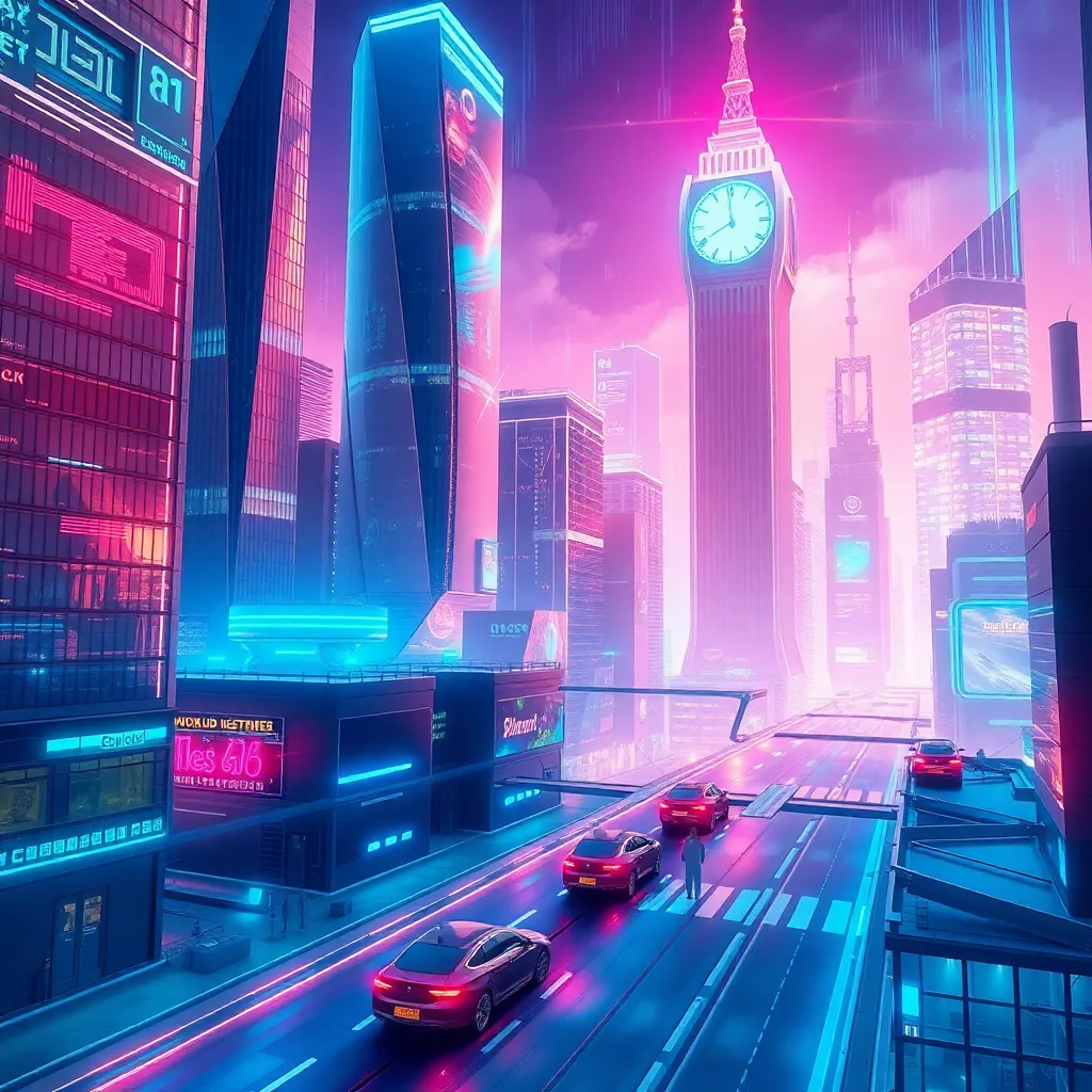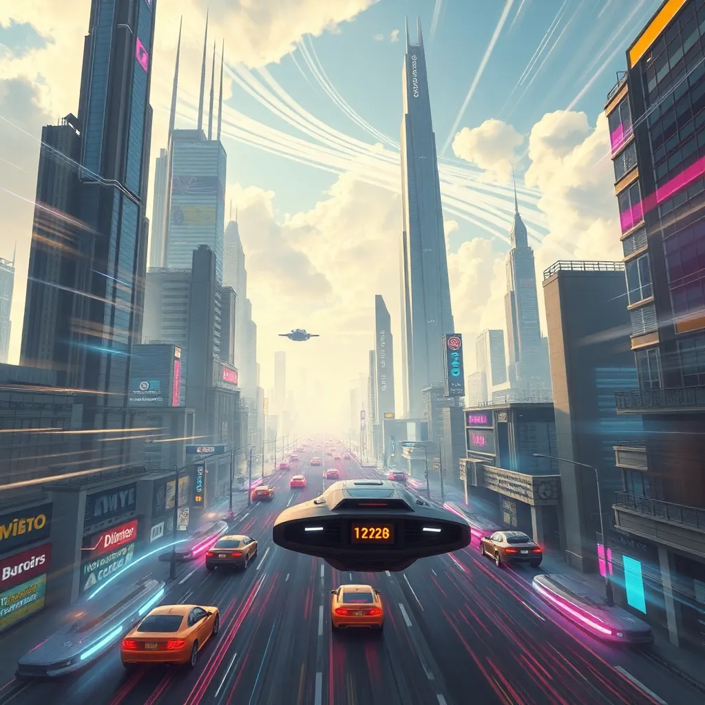 Create a futuristic cityscape with towering skyscrapers, flying cars, and neon-lit streets. Incorporate a sense of movement and energy, with streaks of light and wispy clouds in the background. The scene should evoke a sense of excitement and possibility, with a vibrant color palette and dynamic composition.
