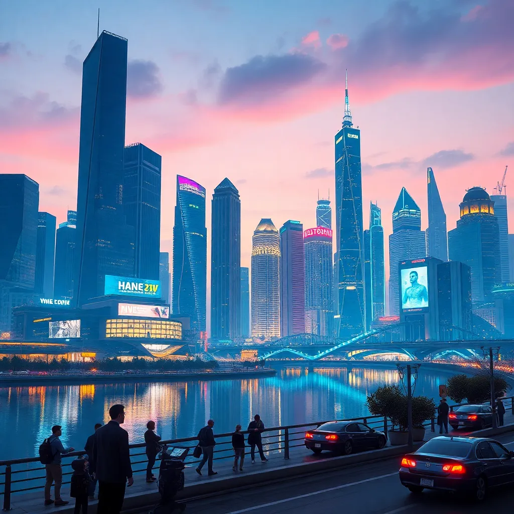 Create a futuristic cityscape at dusk, with sleek skyscrapers and neon lights reflecting off a calm lake. The atmosphere is vibrant and bustling, with humans and robots coexisting in harmony. Incorporate subtle hints of artificial intelligence and technology integration, such as holographic advertisements and self-driving cars.