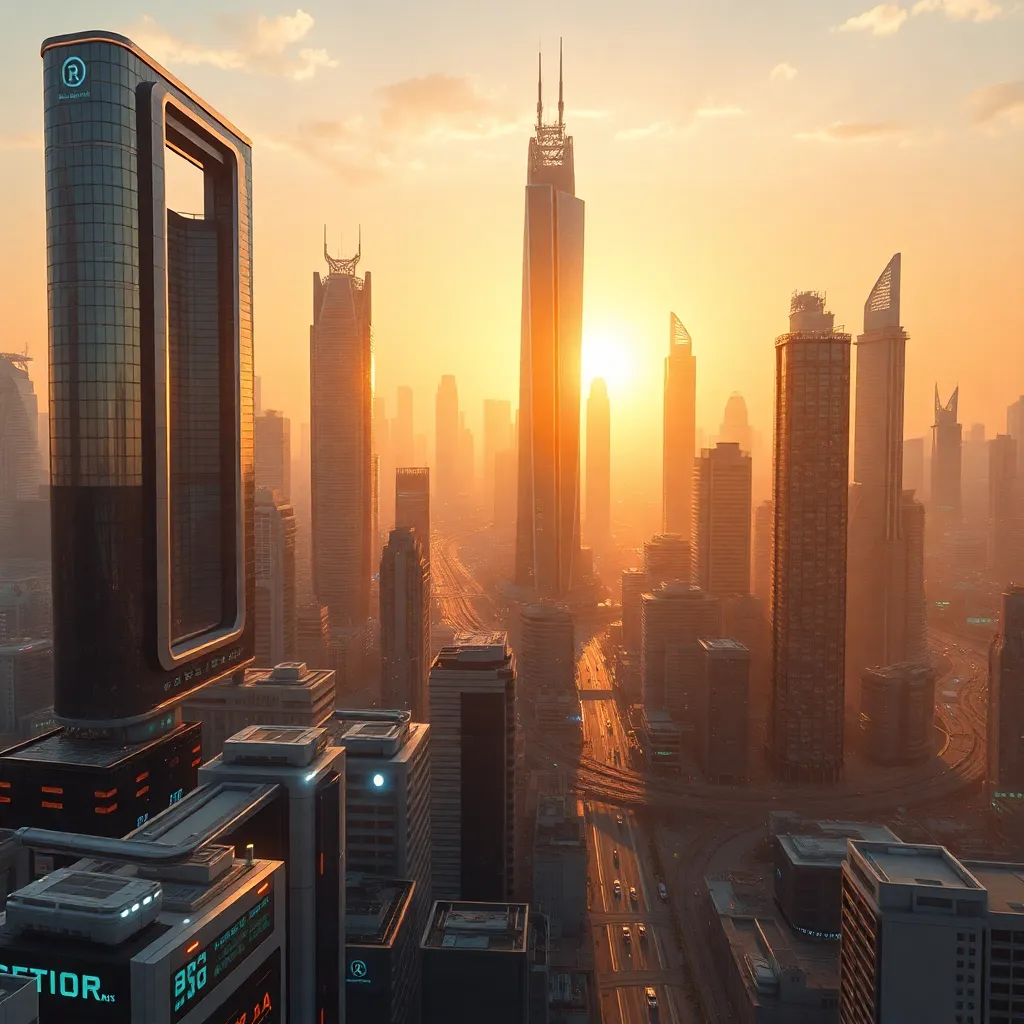 Create a futuristic cityscape at sunset, with towering skyscrapers and flying cars zipping by. The sky is a warm orange hue with a few wispy clouds. Incorporate neon lights and holographic advertisements. The city should be bustling with activity, with people walking and working amidst the futuristic landscape.