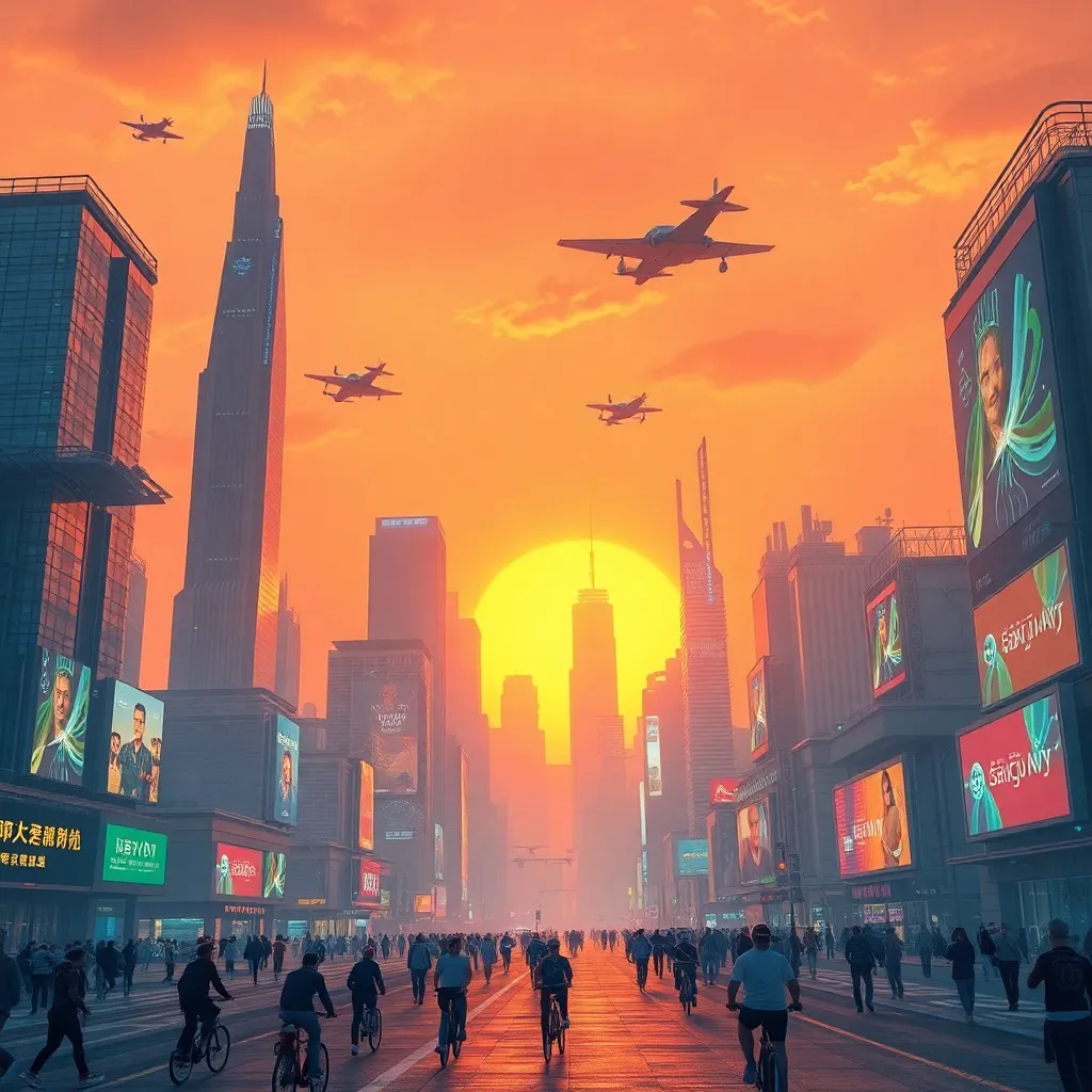 Create a futuristic cityscape at sunset, with towering skyscrapers, flying cars, and a bright orange sky. Incorporate neon lights and holographic advertisements. The scene should be bustling with activity, with people walking, cycling, and using hoverboards. The image should evoke a sense of innovation and progress.