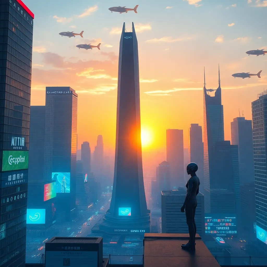 Create an image of a futuristic cityscape at sunset, with a sleek, silver skyscraper in the center, surrounded by holographic advertisements and flying cars zipping by. Incorporate a subtle AI-generated humanoid figure standing on the rooftop, gazing out at the city with a hint of nostalgia and wonder.