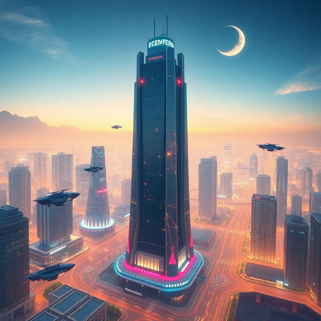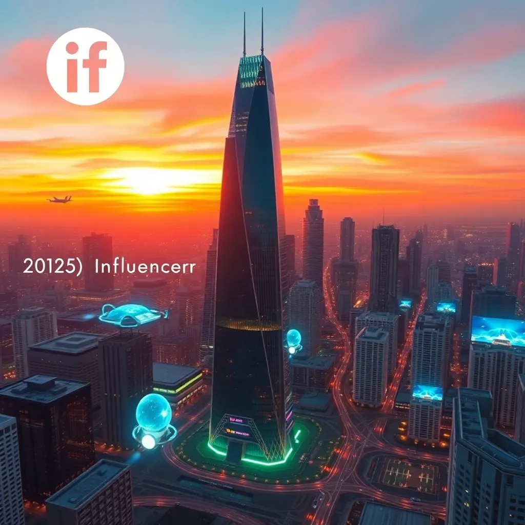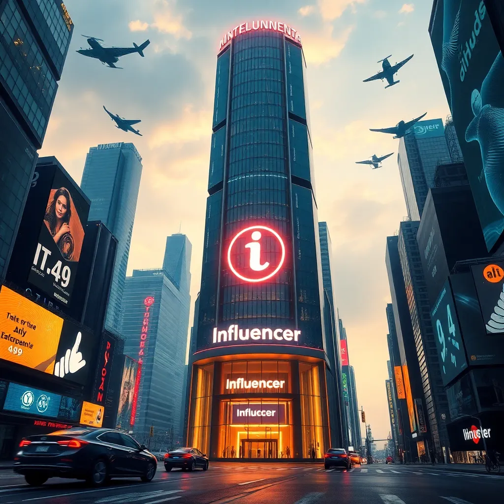 Create an image of a futuristic cityscape with a sleek, high-tech skyscraper in the center, surrounded by holographic advertisements and flying cars zipping by. The building's facade should feature a vibrant, neon-lit logo of a popular AI-powered social media platform, with a glowing 'Influencer' sign above the entrance.