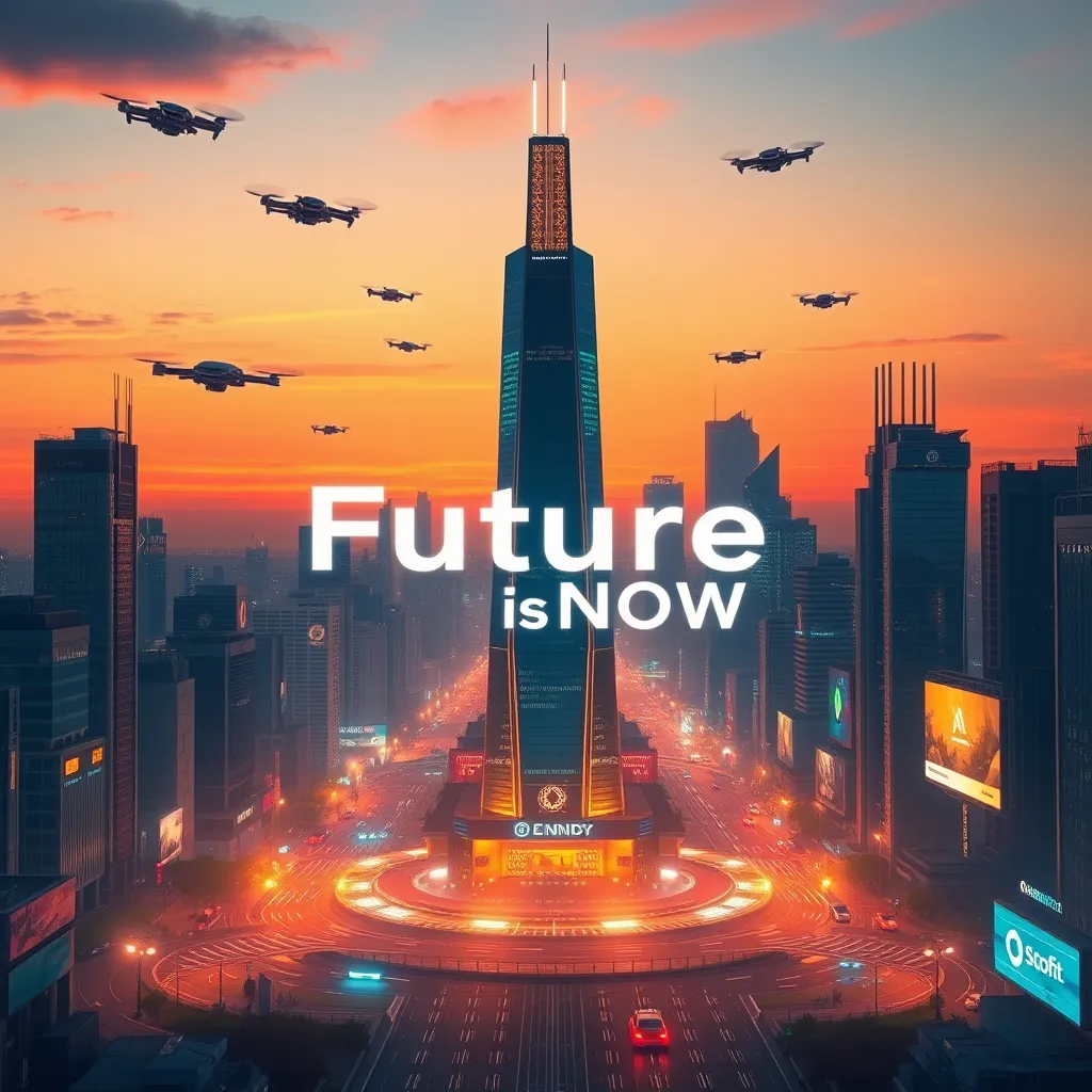 Create an AI-generated image of a futuristic cityscape at sunset, with a sleek, high-tech skyscraper in the center, surrounded by flying drones, hover cars, and neon-lit billboards. Incorporate a bold, futuristic font with the phrase 'Future is Now' written across the sky, with a subtle AI-generated glow effect.
