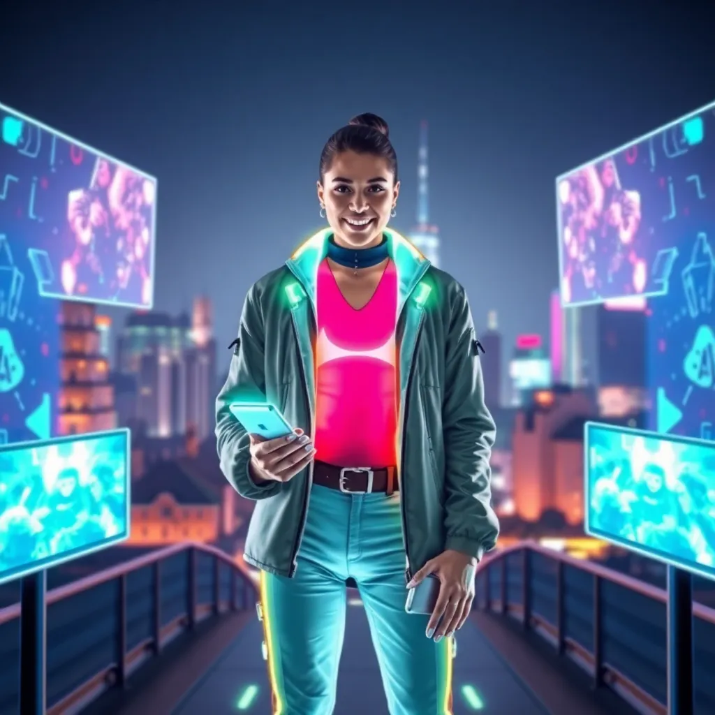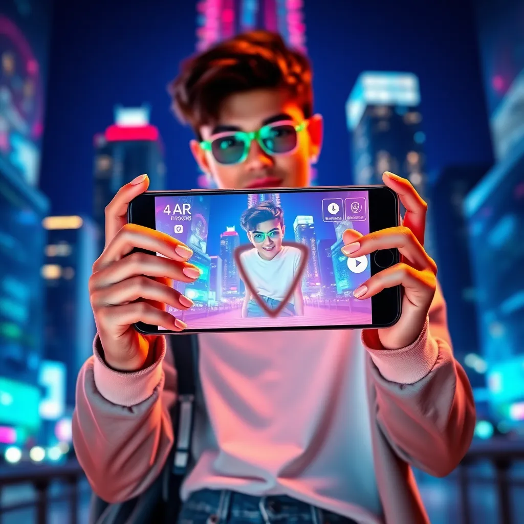 Create an AI-generated image of a young, trendy influencer holding a smartphone with a futuristic augmented reality (AR) filter on the screen. The influencer should be wearing a stylish outfit and standing in front of a cityscape with a bright, neon-lit background. Incorporate bold, vibrant colors and a modern aesthetic.