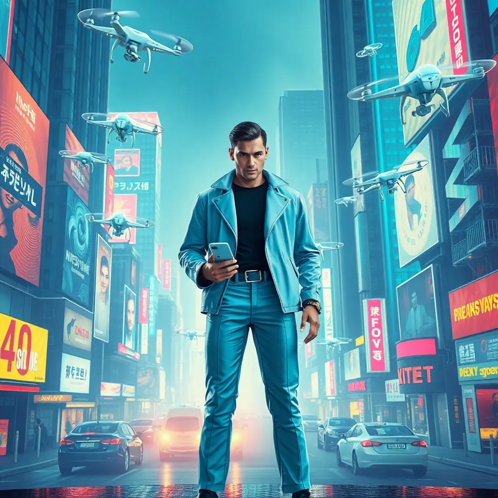 Create an image of a futuristic cityscape with a prominent influencer in the center, surrounded by holographic advertisements and flying drones. The influencer should be dressed in a sleek, high-tech outfit and holding a futuristic smartphone. The cityscape should be vibrant and neon-lit, with a subtle sense of nostalgia.