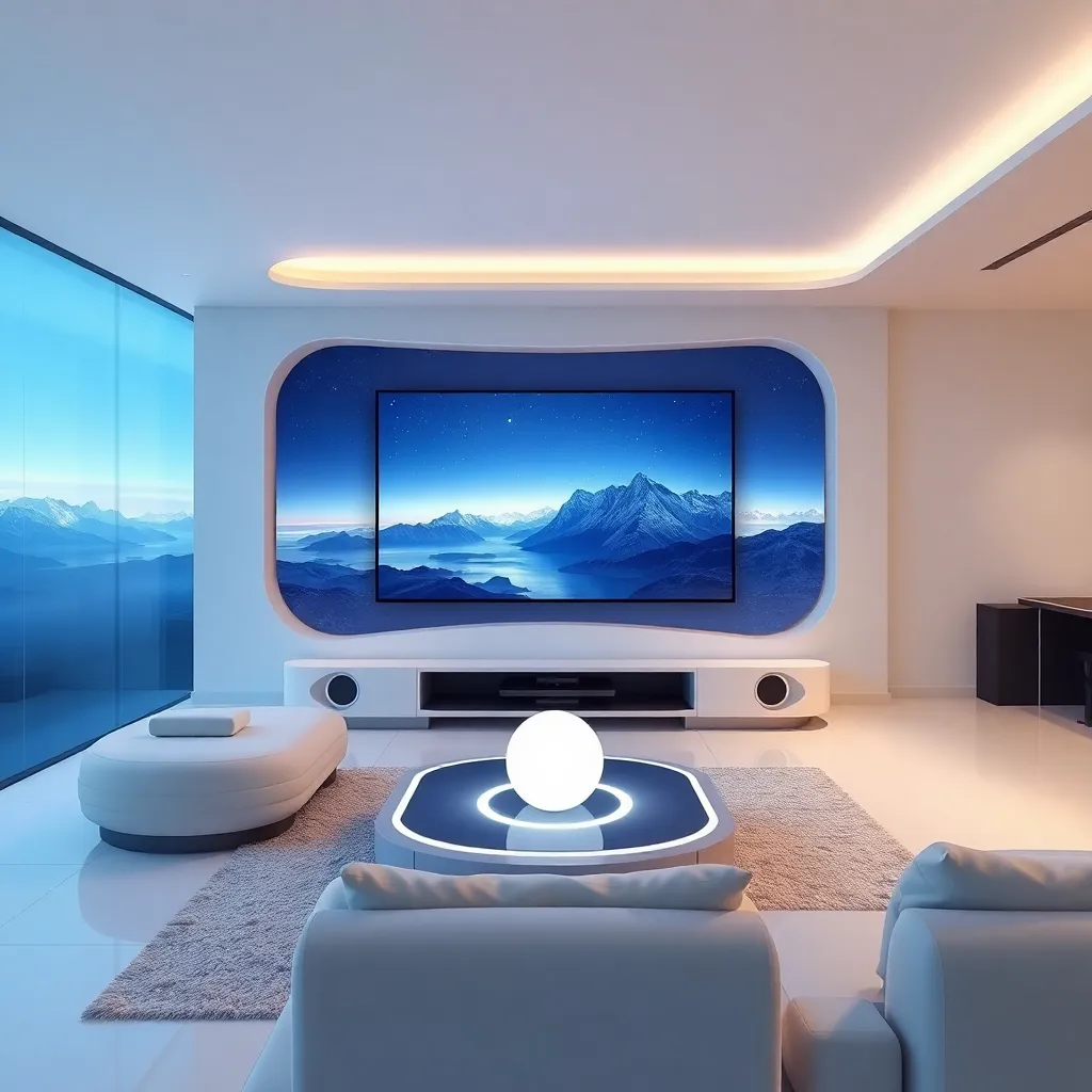 Create an AI-generated image of a futuristic, minimalist living room with a sleek, curved TV screen displaying a stunning virtual reality landscape. Incorporate a comfortable, high-tech couch with built-in speakers and a futuristic coffee table with a glowing, orb-like centerpiece. Style the room with a cohesive, monochromatic color scheme.