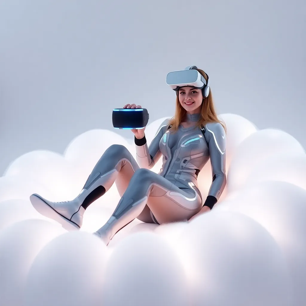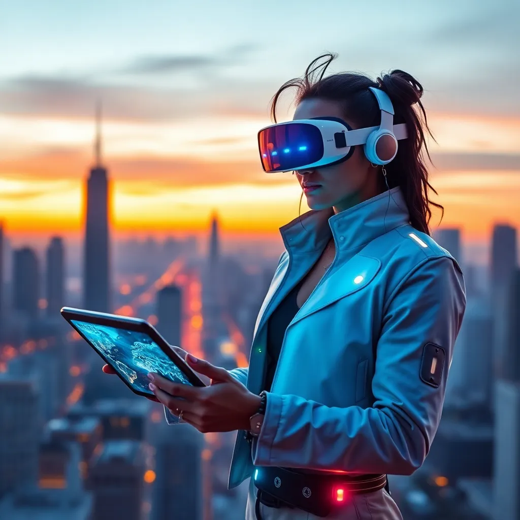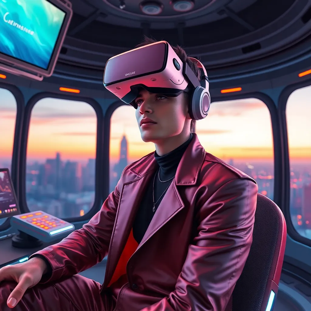 Create an AI-generated image of a futuristic influencer sitting in a virtual reality space, surrounded by holographic screens and futuristic gadgets, with a cityscape at dusk in the background. The influencer should be wearing a sleek, high-tech outfit and having a mesmerizing gaze, conveying a sense of innovation and tech-savviness.