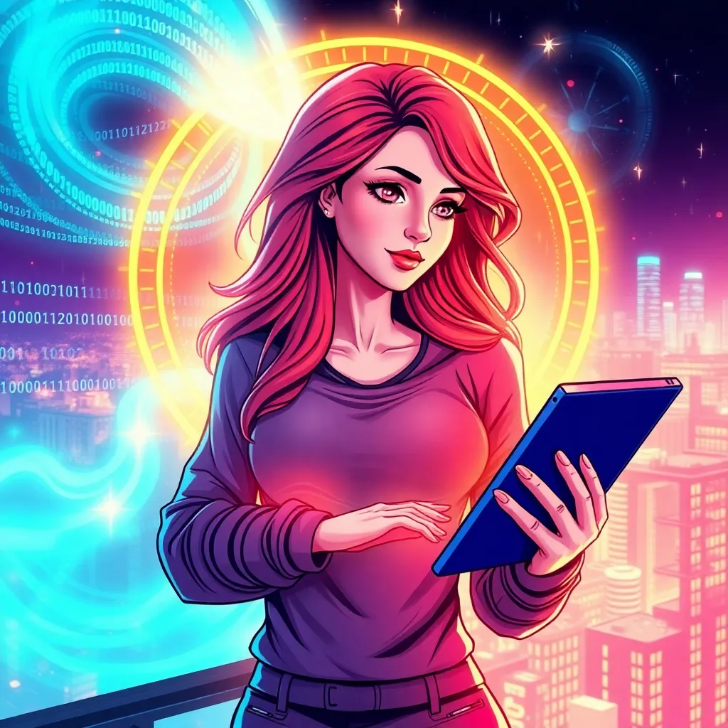 Create a futuristic illustration of a young woman with a glowing aura, surrounded by swirling clouds of code and binary numbers. She's holding a tablet with a cityscape in the background, symbolizing her influence over the digital world. Incorporate neon lights and vibrant colors to give it a modern and edgy vibe.