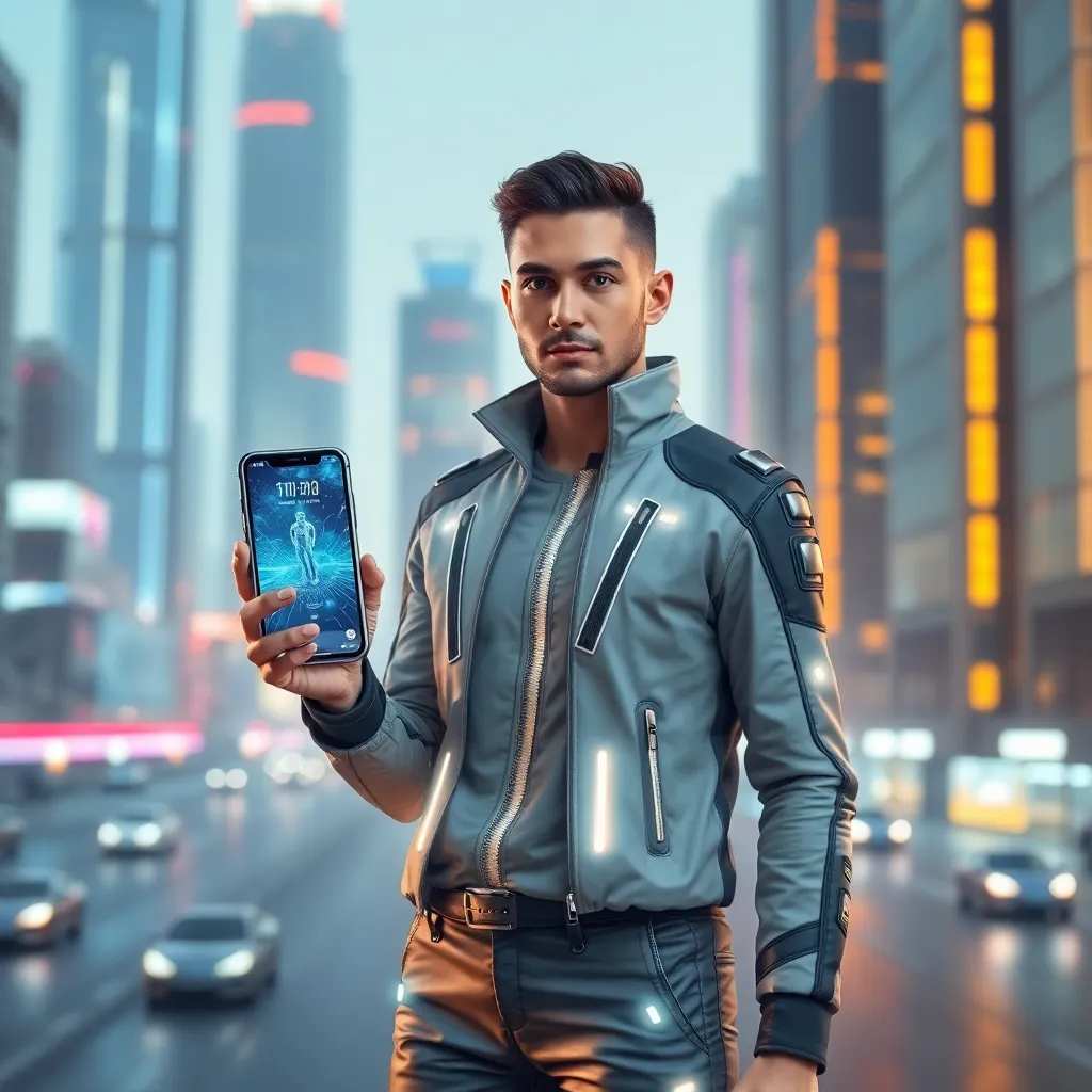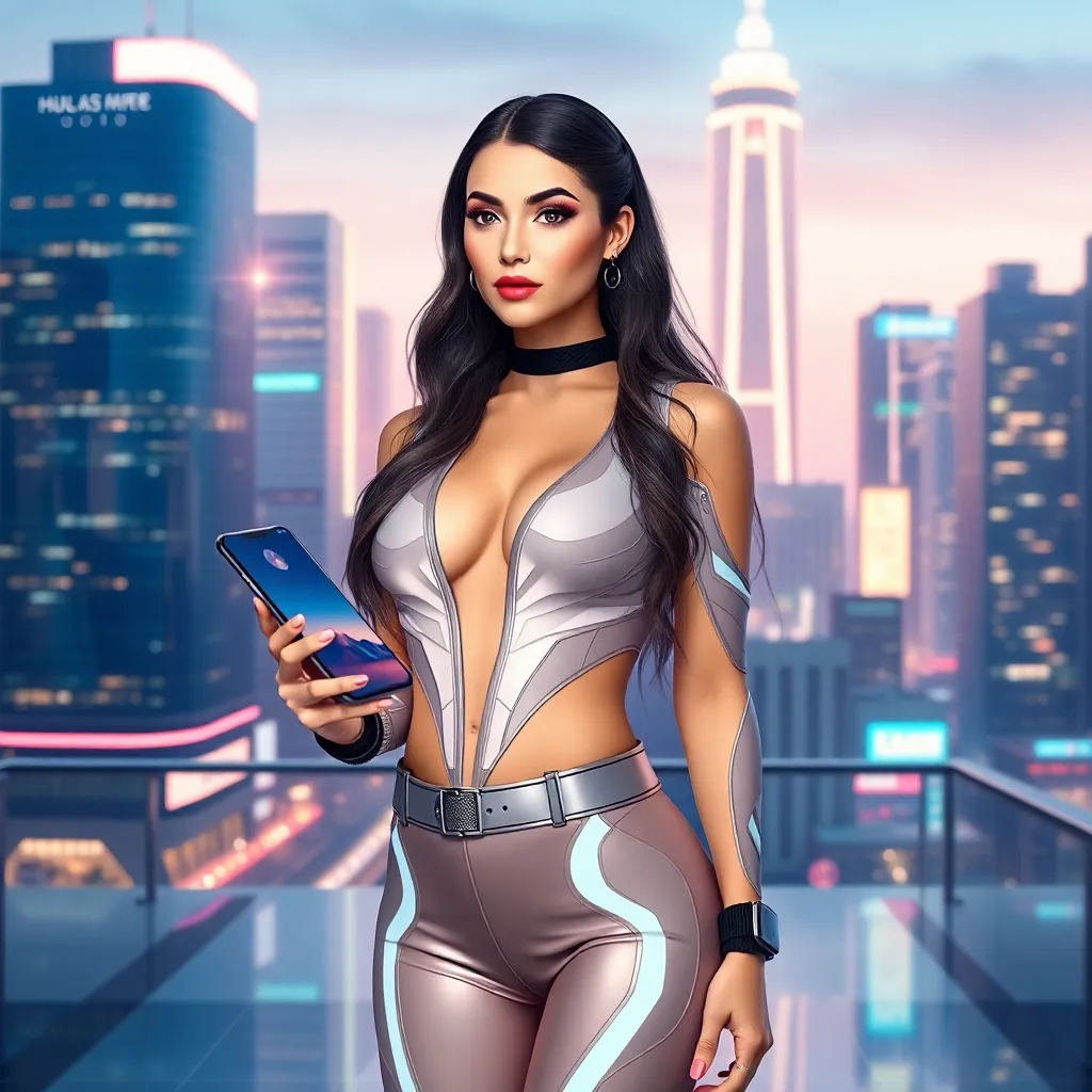Create an AI-generated image of a futuristic influencer standing in front of a sleek, neon-lit cityscape, holding a smartphone with a holographic display. The influencer is dressed in a stylish, high-tech outfit with glowing accents, conveying confidence and innovation. The background is a blurred cityscape with towering skyscrapers and flying cars.