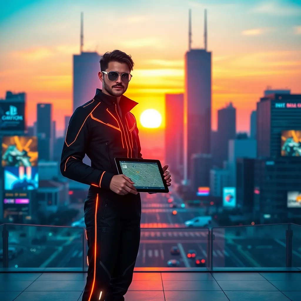 Create an image of a futuristic influencer standing in front of a cityscape at sunset, surrounded by holographic advertisements and neon lights. The influencer is dressed in a sleek black jumpsuit with glowing accents, holding a tablet with a city map displayed. The background is a vibrant blend of blues and oranges.