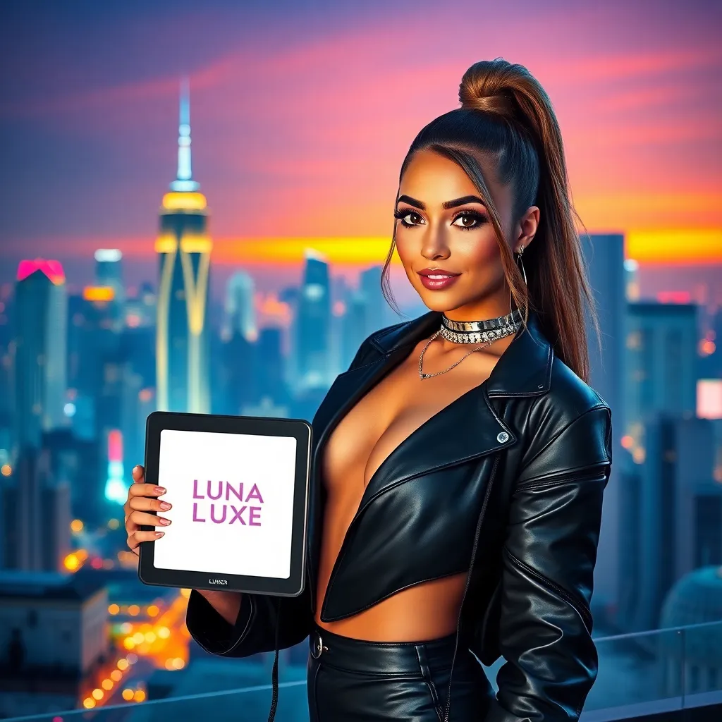 Create an image of a trendy social media influencer, 'Luna Luxe', posing in front of a neon-lit cityscape at sunset. She's wearing a bold, futuristic outfit with metallic accents and holding a tablet displaying her popular beauty and lifestyle brand's logo. Incorporate a subtle glow effect to give the image a futuristic vibe.