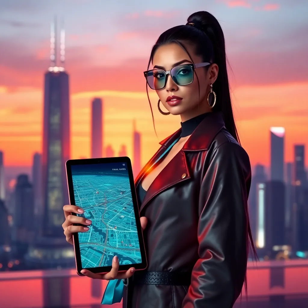 Create an image of a futuristic influencer standing in front of a sleek, neon-lit cityscape at sunset. The influencer is dressed in a bold, avant-garde outfit with glowing accents, holding a tablet displaying a futuristic city map. The image should exude confidence, innovation, and a sense of limitless possibility.