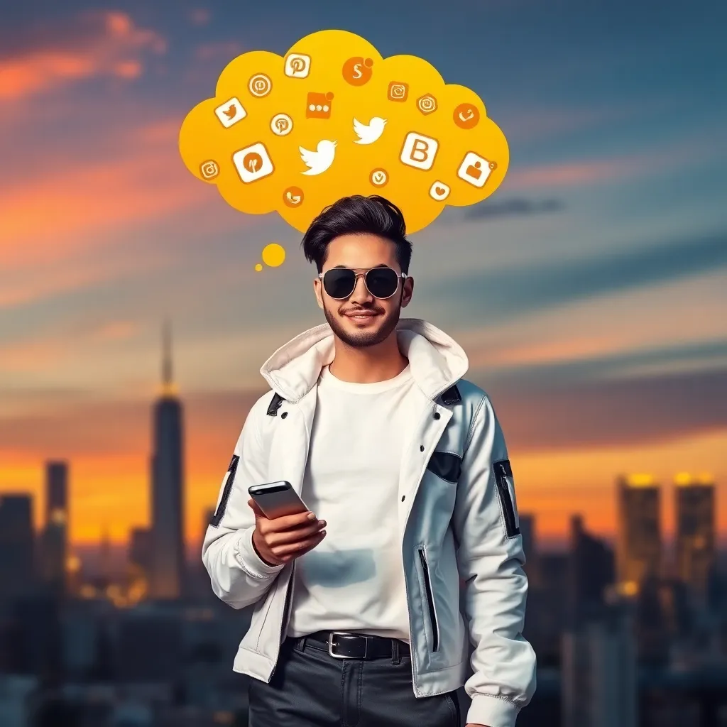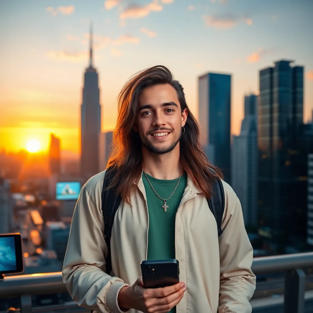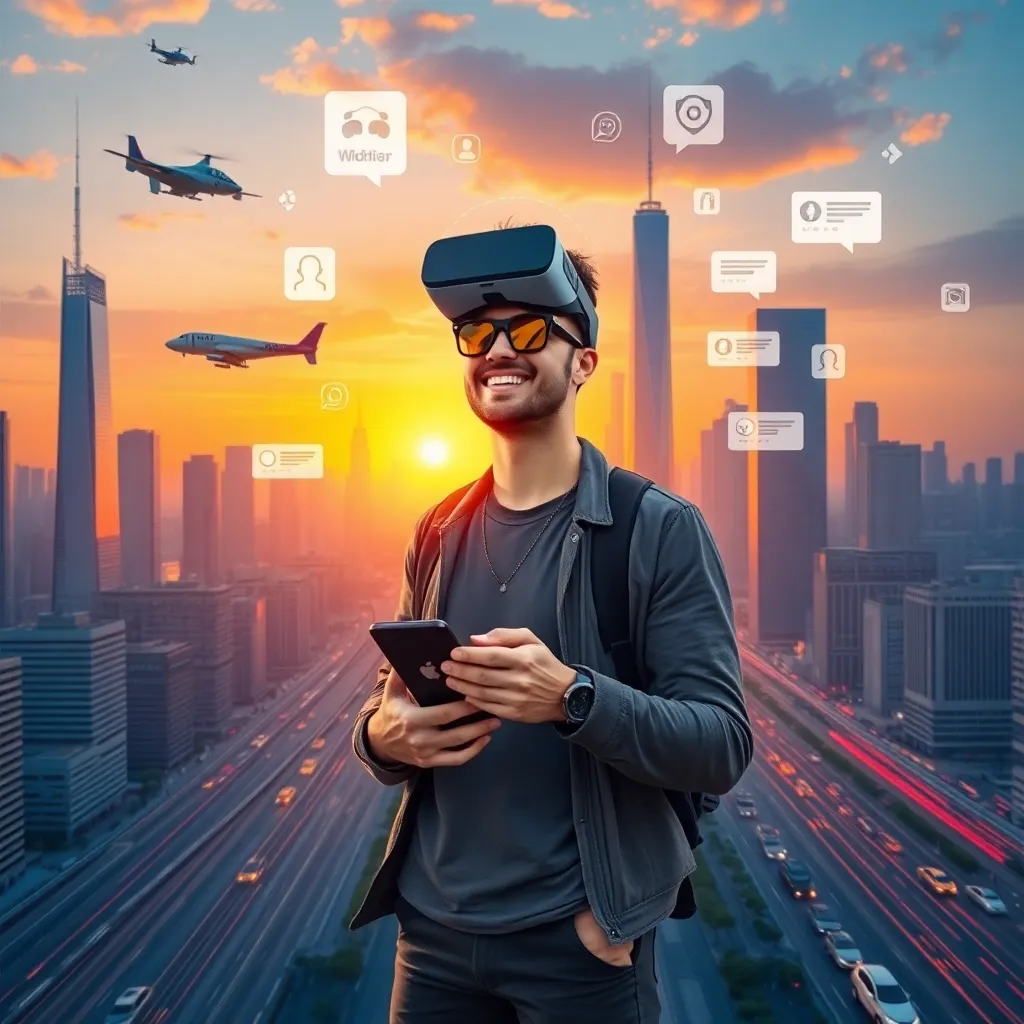 Create an AI-generated image of a futuristic cityscape at sunset, with towering skyscrapers and flying cars zipping by. Incorporate a prominent influencer figure in the center, dressed in trendy attire, with a smartphone and a confident smile, surrounded by a halo of social media notifications and virtual reality goggles.