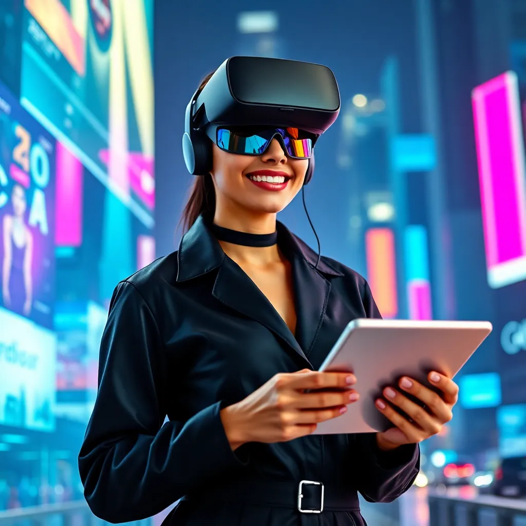 Create an image of a futuristic social media influencer, dressed in a sleek black jumpsuit, surrounded by holographic screens and virtual reality goggles. The influencer should be smiling confidently, with a tablet in hand, showcasing their latest AI-generated content. Incorporate neon lights and cityscape in the background.