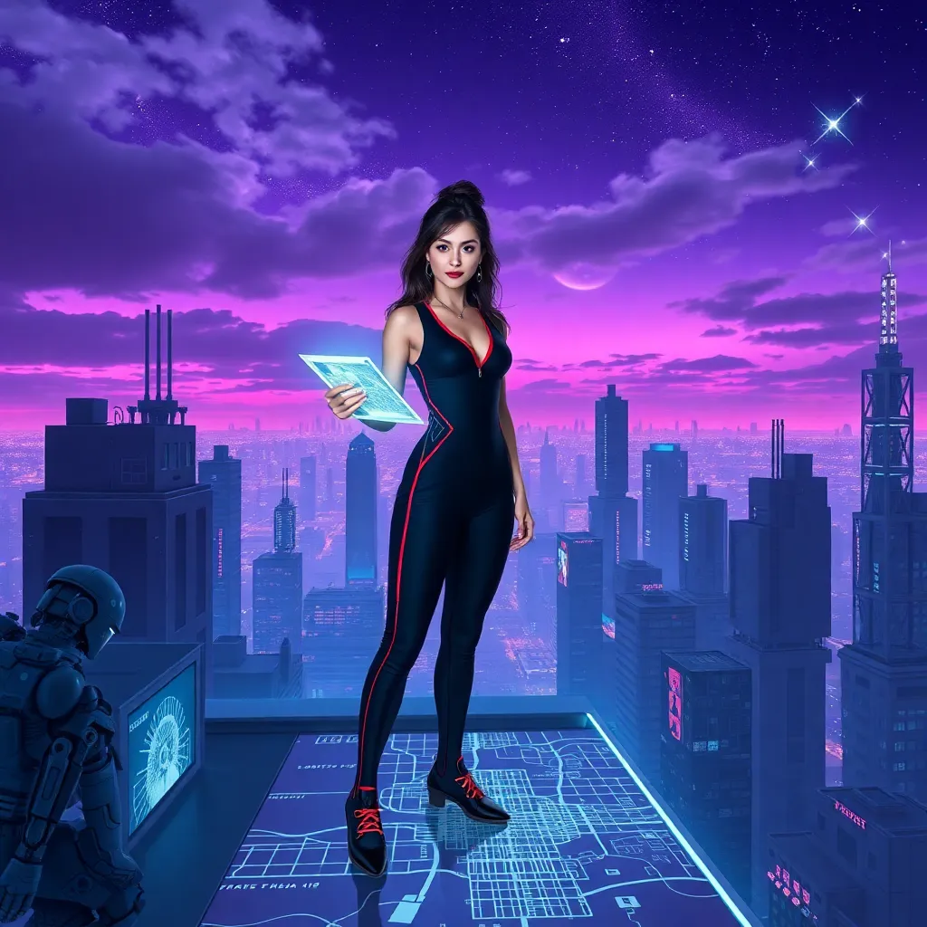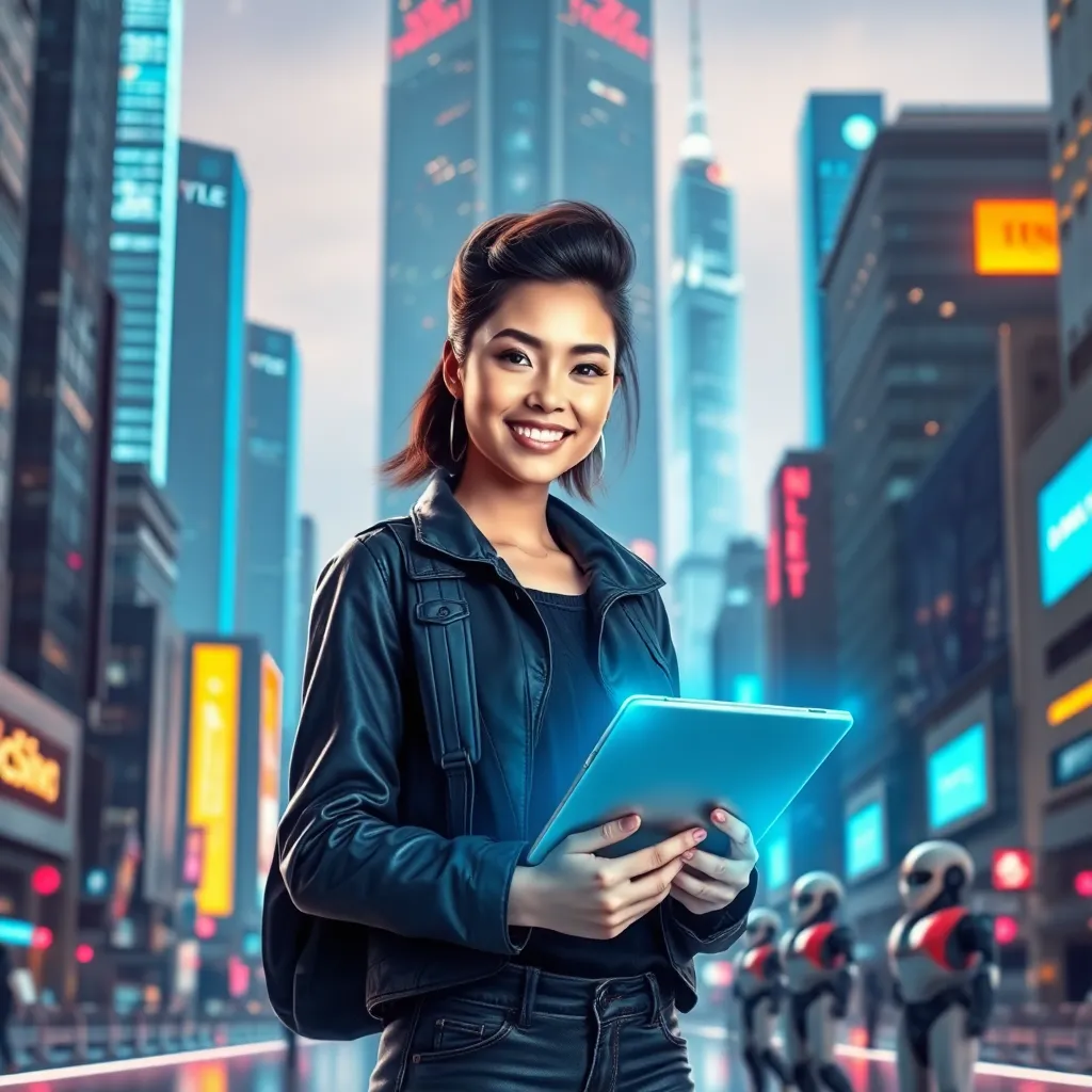 Imagine a futuristic cityscape with towering skyscrapers and neon lights. A young woman with a bold hairstyle and trendy outfit stands in the foreground, surrounded by holographic screens and robots. She's holding a tablet and smiling confidently, symbolizing innovation and technology. Create an AI-generated image that captures this futuristic vibe.