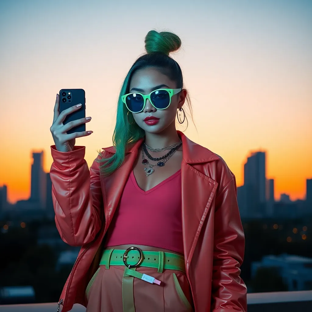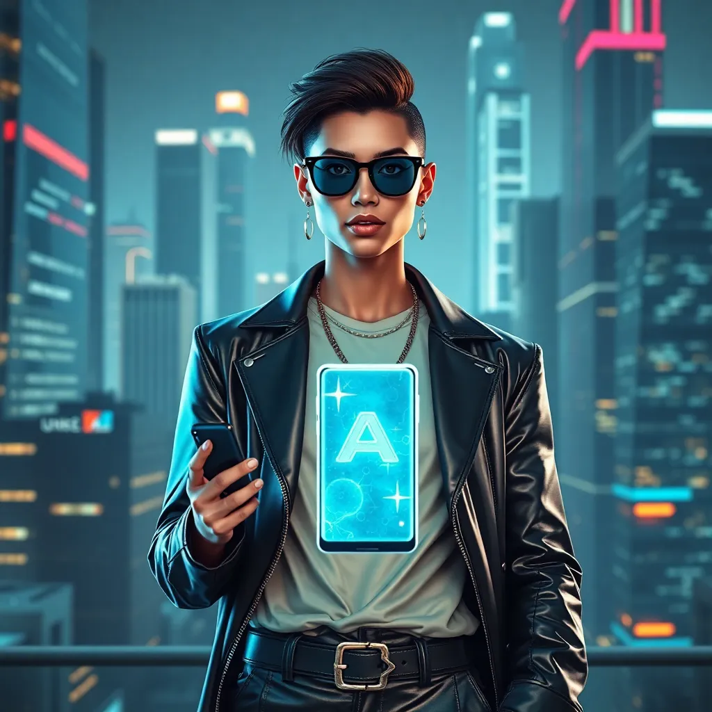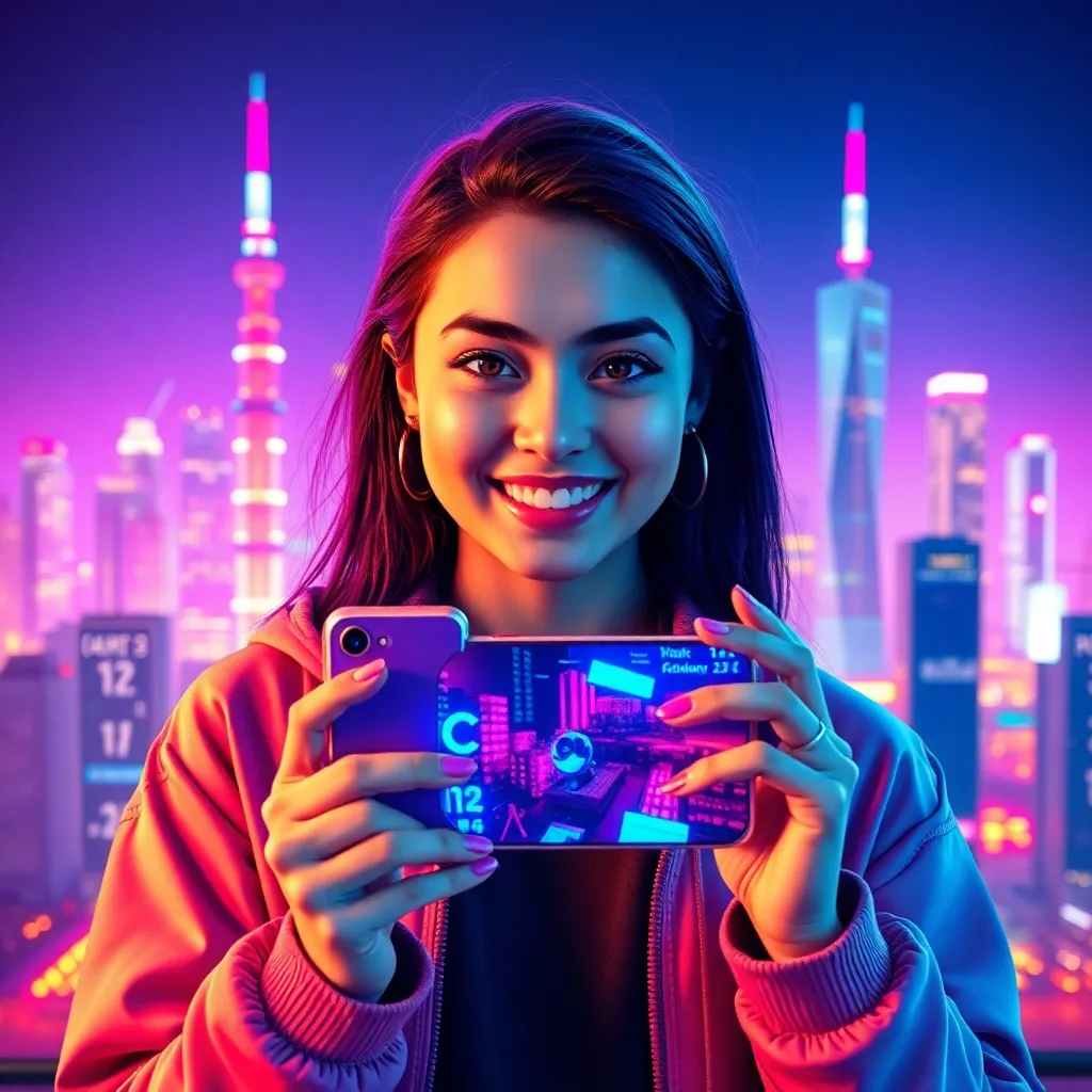 Create an AI-generated image of a young, trendy, and tech-savvy influencer (think Gen Z style) holding a futuristic smartphone with a stunning cityscape in the background. Incorporate vibrant colors and neon lights to give it a futuristic and eye-catching vibe. Make sure the influencer is smiling and looking directly at the camera.